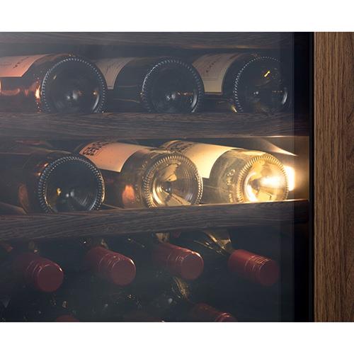 庫内上部、および左右側面は高さ違いに暖色系のLED照明を配置しワインボトルを探しやすくしました。LED照明が庫内全体を照らし出し、お気に入りのワインボトルを美しく照らし出します。