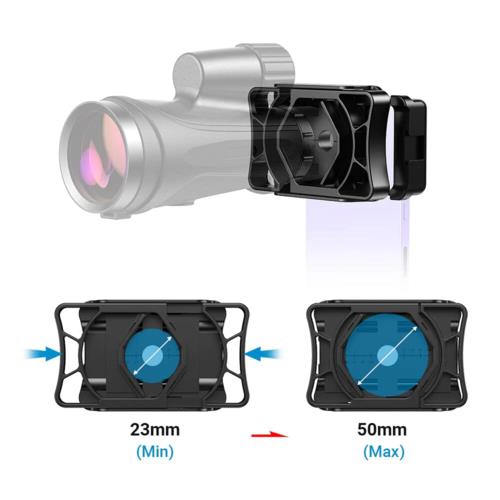 直径23~50mmのほぼすべての接眼レンズに適合し、幅66~95mmのスマートフォンが装着できます。
