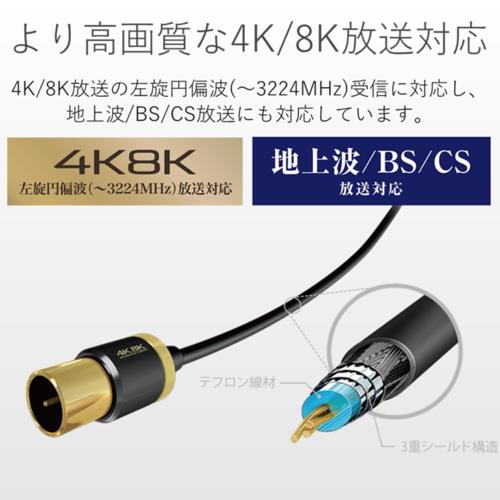 ■従来の地上波(地デジ)放送やBS放送、CS放送に加え、4K8K放送の視聴・録画に対応したTV接続用アンテナケーブルです。