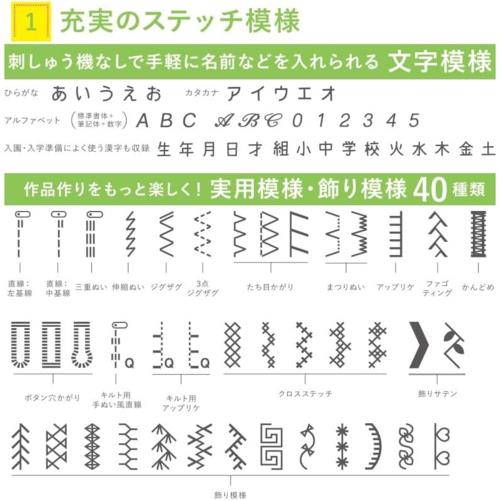 ・主な機能:文字縫い、縫い模様40種類、2ステップ糸通し、下糸クイック、かんたん下糸巻き、7枚送り歯、押え固定ピン、全自動ボタン穴かがり、LEDライト、針停止位置切替、エラーメッセージ、ゆっくりスタート、バックライト付き液晶ディスプレイ