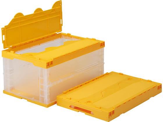 フタ上面ラベル剥離用線シボ面有。インシュロックによる封印可能。●色:透明/イエロー●内容量:74.1L●外寸:649×439×338mm●有効内寸:600×405×305mm●おりたたみ時高さ:85mm●底面形状:斜格子リブ●圧縮荷重:13.92kN(1420kgf)●材質:PP●サンロック付●注文単位:1個