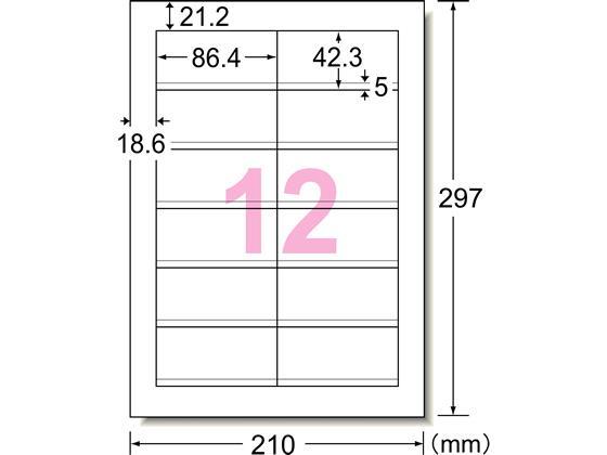 ●仕様:12面(2列×6段) ●サイズ:A4(210×297mm)●ラベルサイズ:86.4×42.3mm●材質:上質紙●マット紙●標準総厚み:0.19mm●坪量:180g/m2●ラベル厚み:0.13mm●白色度:91%●対応プリンタ:インクジェット(染料/顔料)、レーザー(カラー/モノクロ)、コピー(カラーのみ)●注文単位:1冊(100枚)●GPNエコ商品ねっと掲載