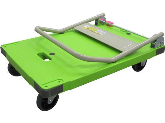 ●色:グリーン●積載サイズ:幅600×奥行900mm●重量:16.9kg●材質:荷台/ポリプロピレン、ハンドル/スチール●荷台高さ:203mm●ハンドル高さ:861mm●車輪径:125mm●最大積載荷重:300kg●床面を汚さない、グレー車輪採用●ハンドルを折畳めます