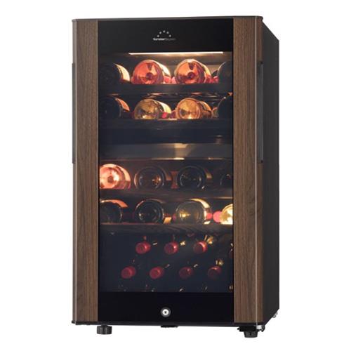ウッドブラウンの外観とよくマッチした木製飾り付きスライド式ワイヤーラックを標準装備。ワインボトルの配置を手前と奥の二列配列とし、コンパクトなサイズに比して余裕のある収容本数を確保しています。スライド式ラックは手前半分まで引き出せるため、安全性を確保しながらも奥のワインボトルが取り出しやすい設計となっています。