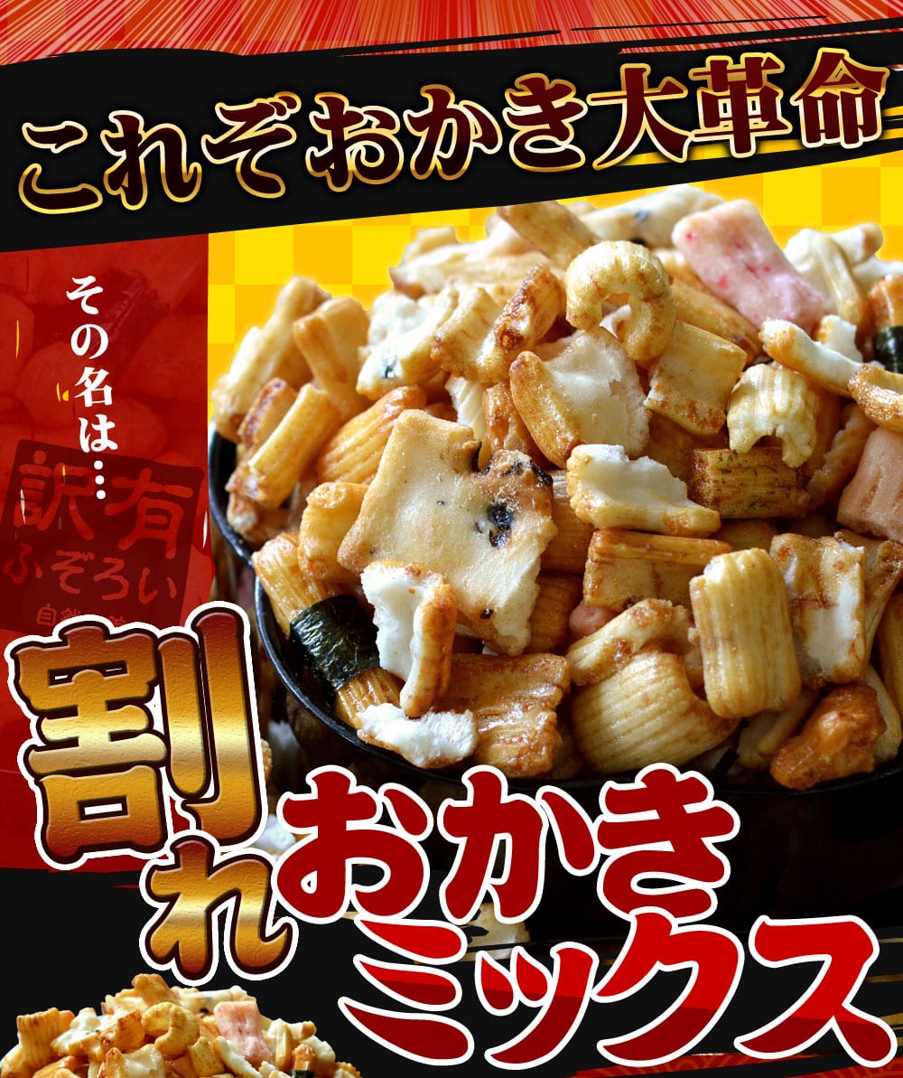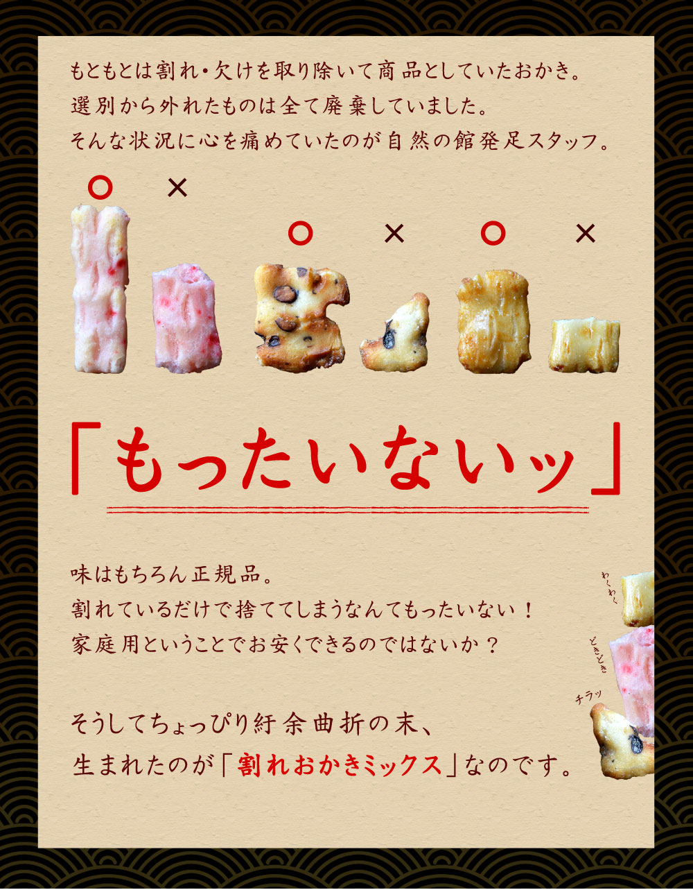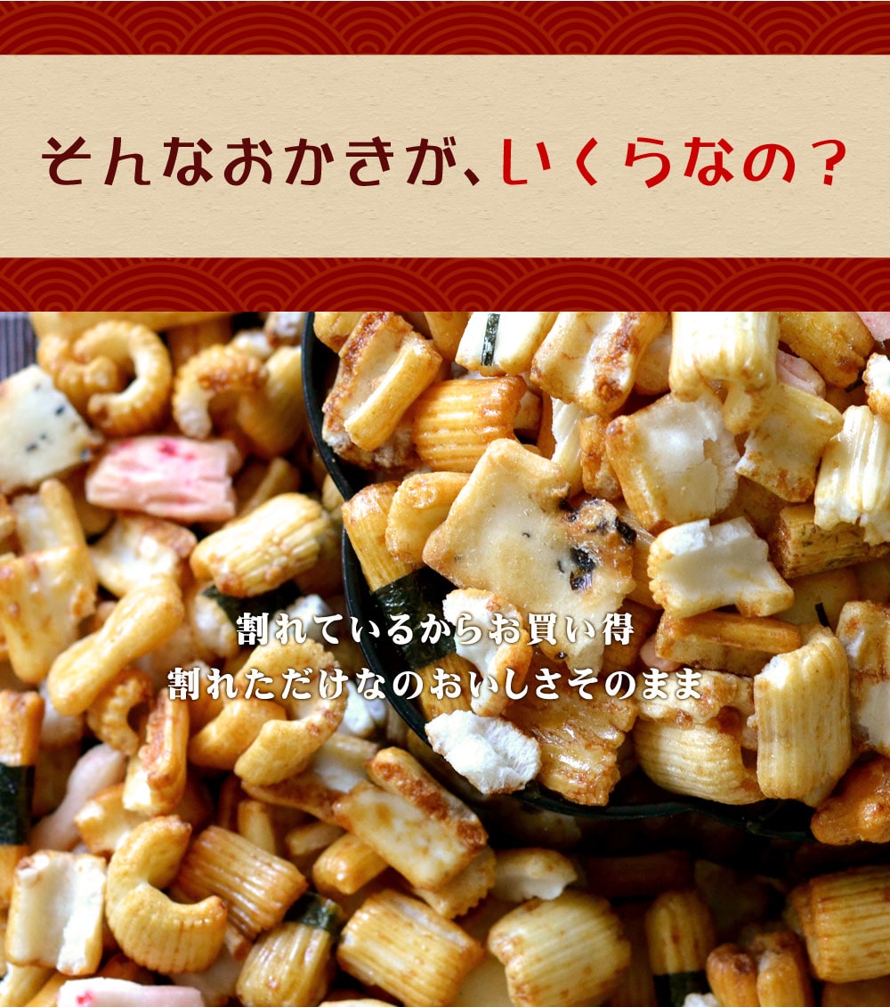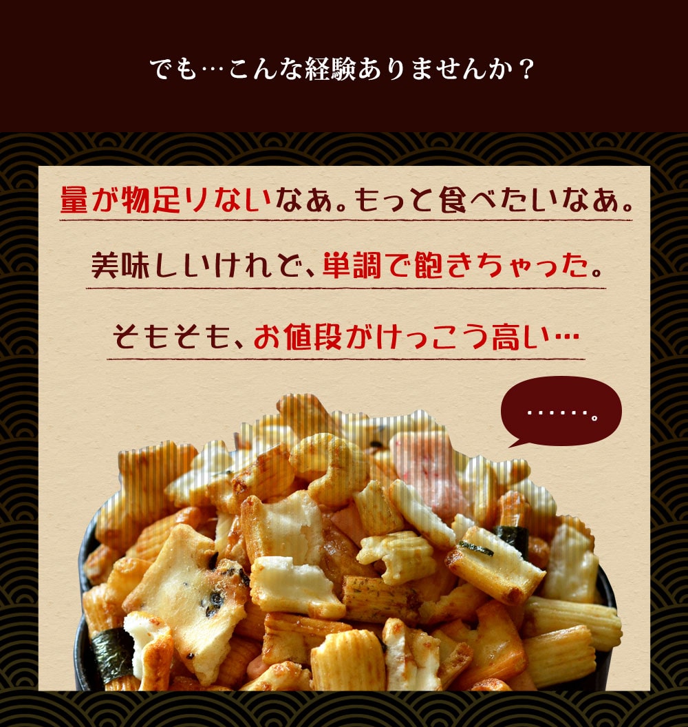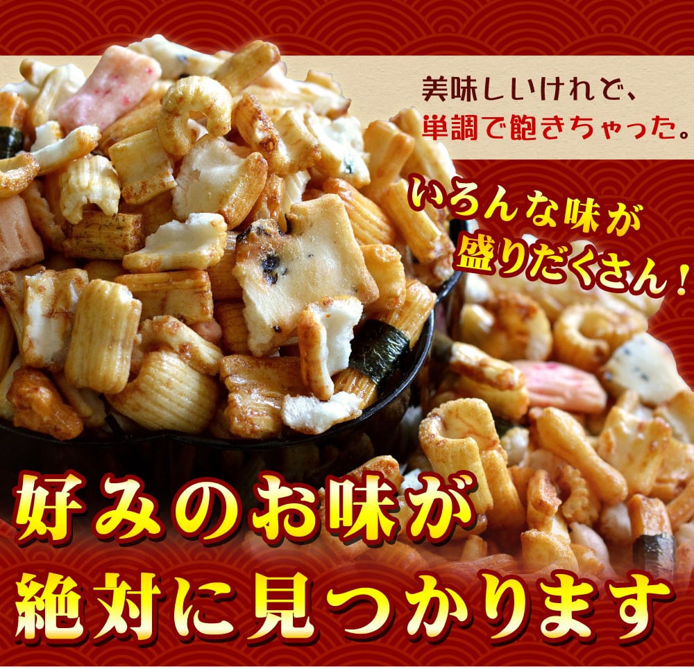 | 原材料名 | もち米(中国産)、しょうゆ、砂糖、でん粉、発酵調味料、黒大豆、植物油、えび、かつおエキス、風味調味料、昆布エキス、酵母エキス、食塩、のり/調味料(アミノ酸等)、着色料(赤102)、(一部に小麦・えび・大豆を含む) |