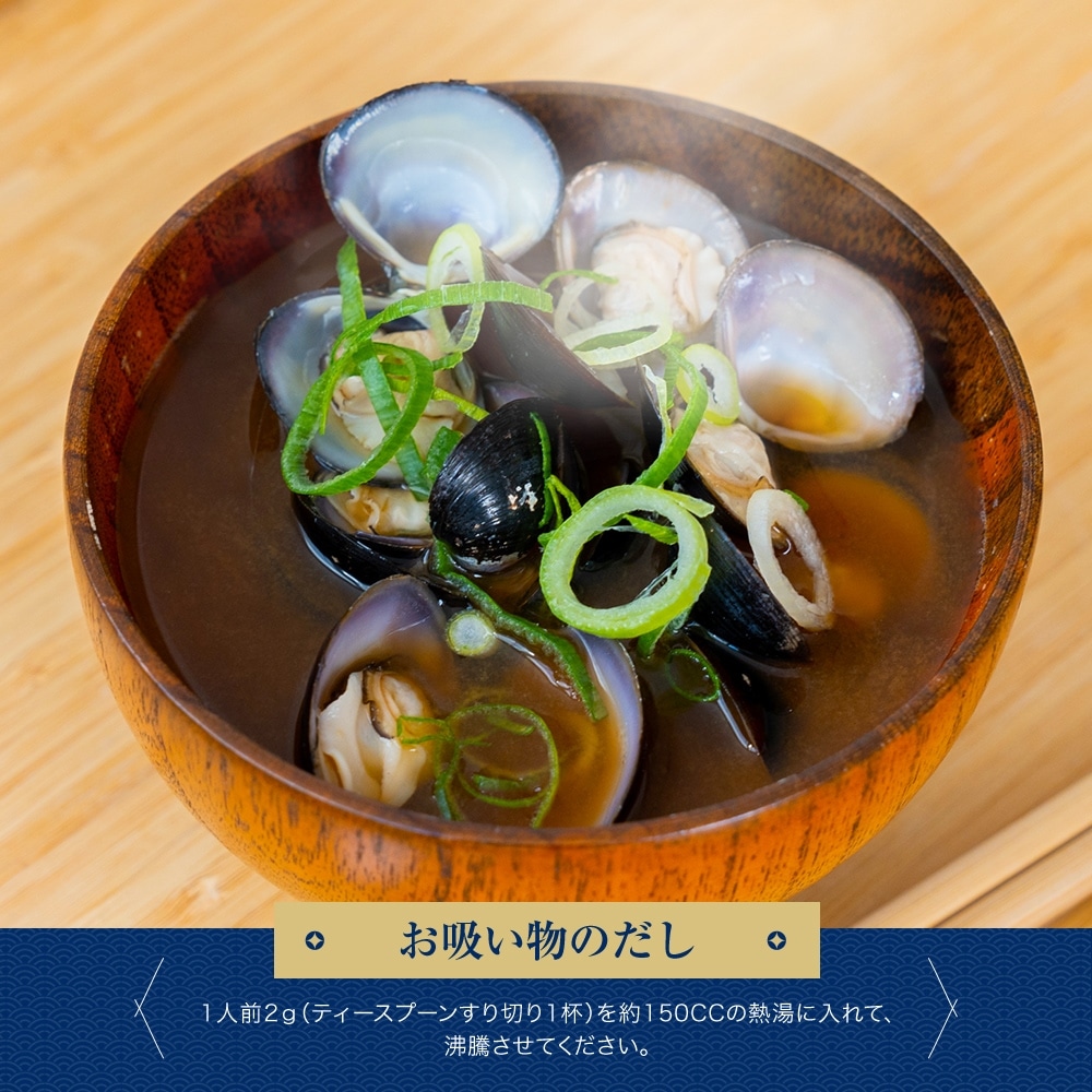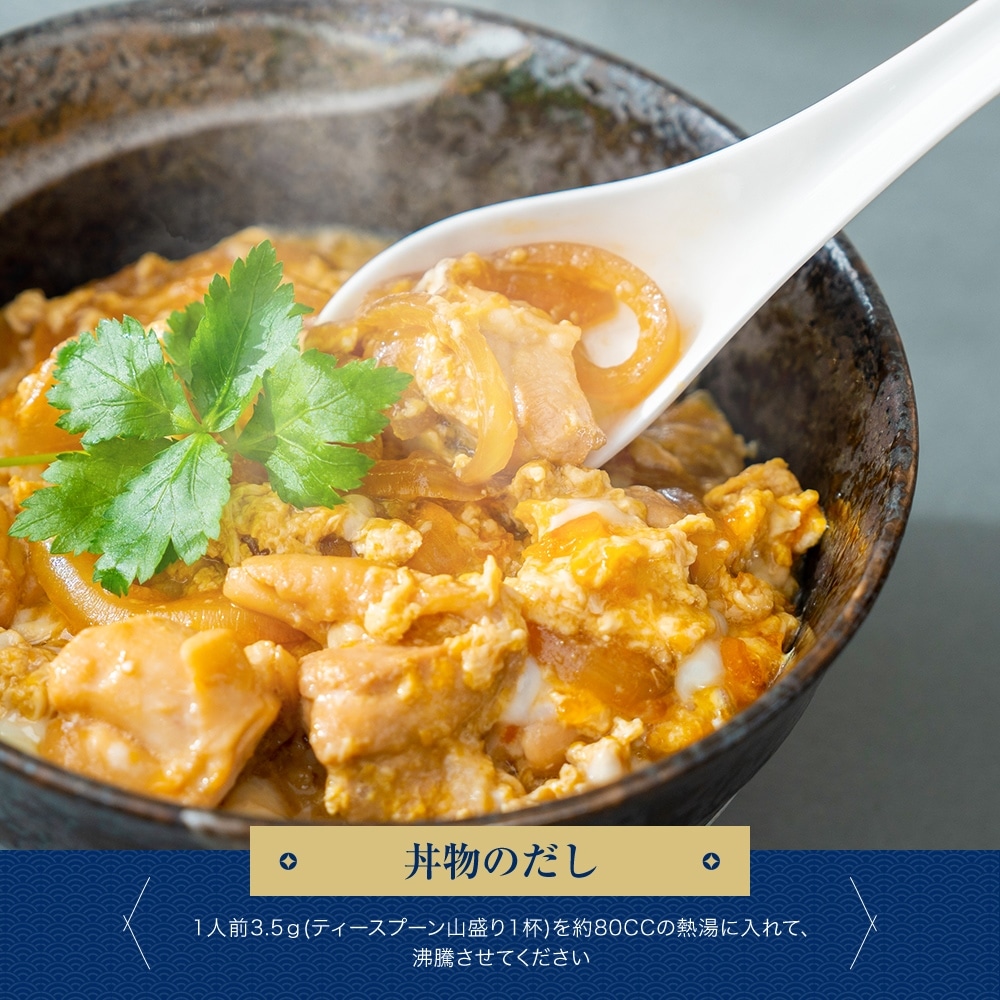 | ご使用方法 | 麺類のつゆ・おでん 一人前7g(ティースプーン山盛2杯)を250cc?270ccの熱湯に入れ沸騰すれば出来上がりです。 丼物 一人前3.5g(ティースプーン山盛1杯) みそ汁・お吸い物 一人前2g(ティースプーンすり切れ1杯) ※お好みに合わせて加減して下さい。 その他、煮物料理、鍋料理、炊き込みご飯、茶碗蒸し、炒め物、焼き飯、焼きそば、お好み焼きなどにもご利用いただけます。 |
