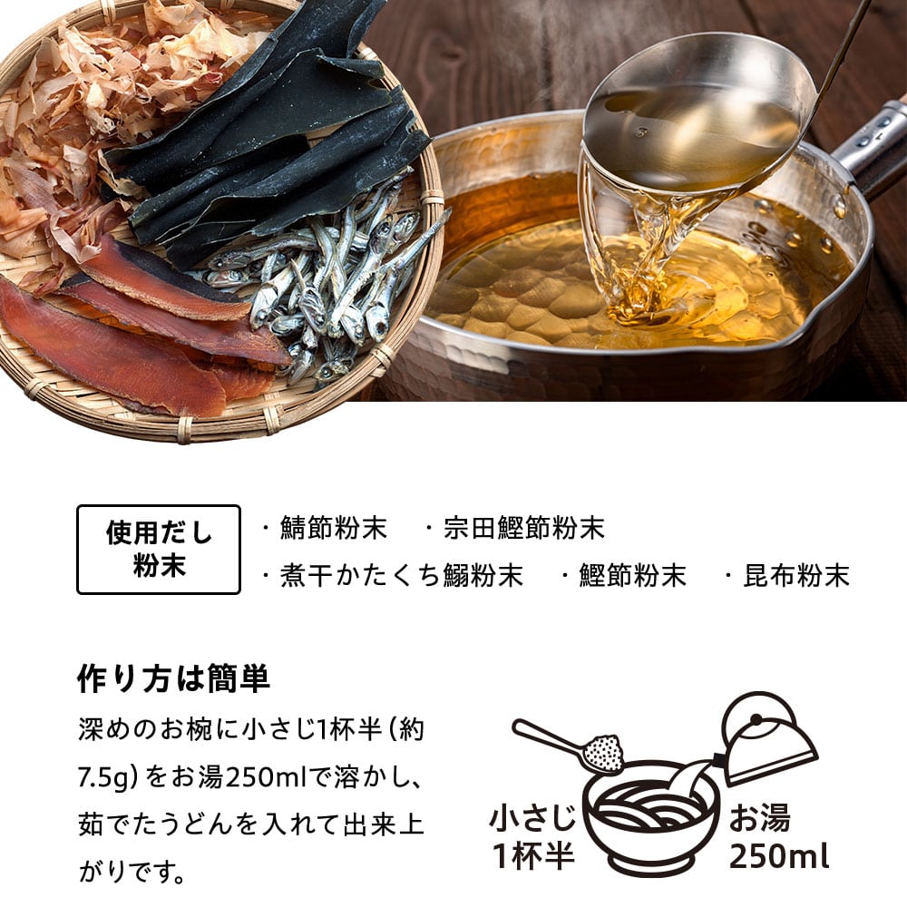 | 調理方法 | 深めのお椀に小さじ1杯半(約7.5g)をお湯250mlで溶かし、茹でたうどんを入れて出来上がりです。※お湯の分量はお好みに合わせて調節してください。 |