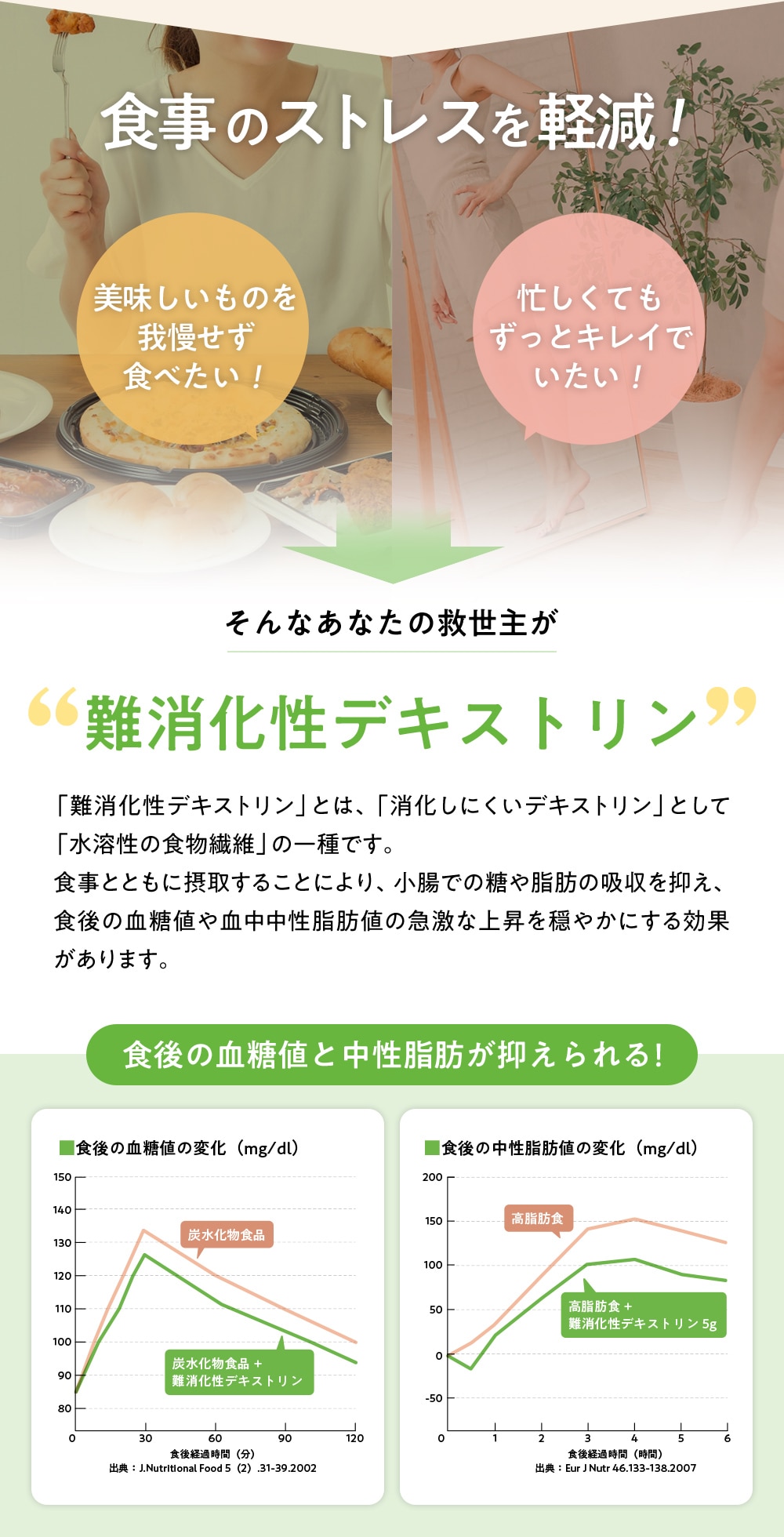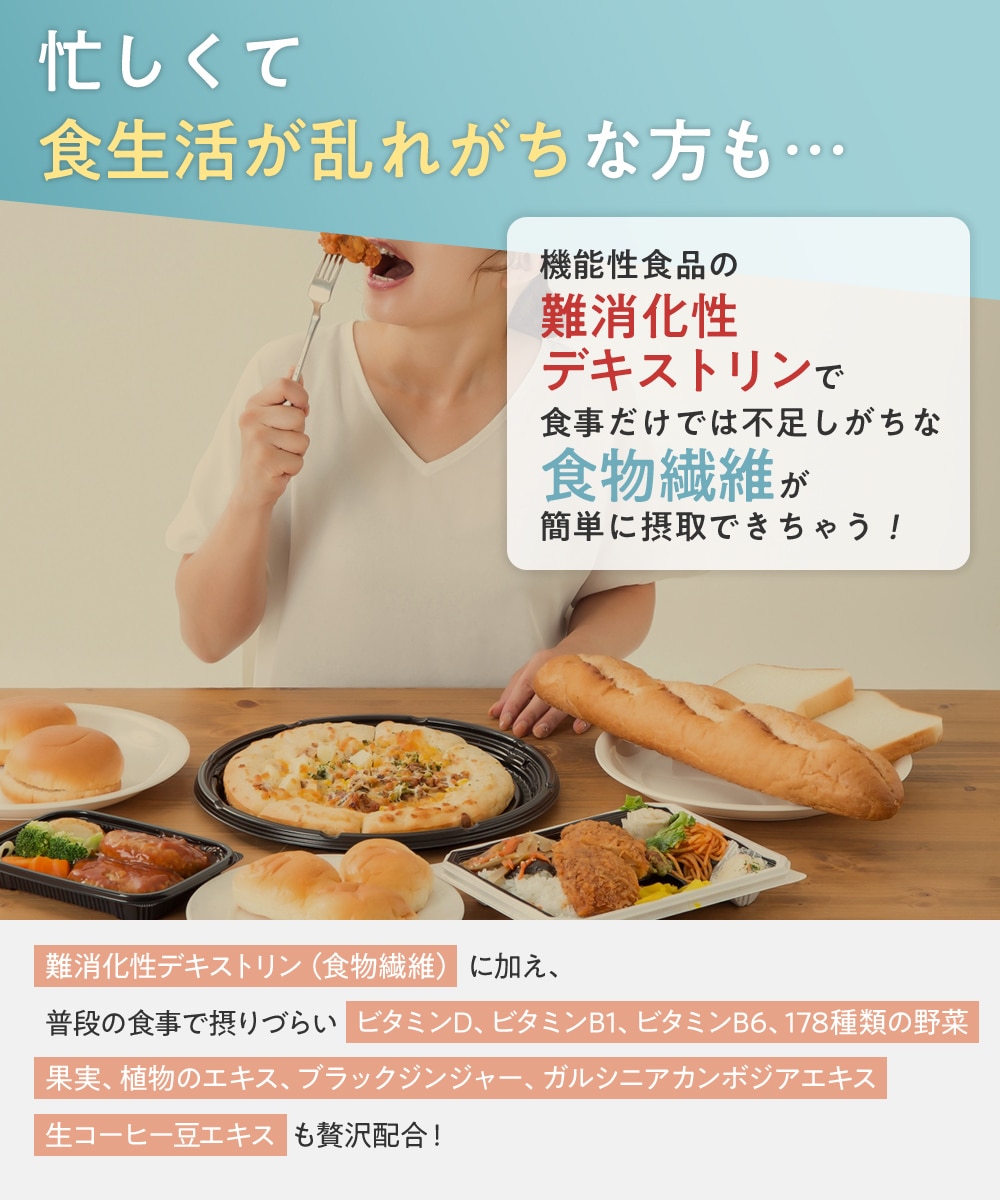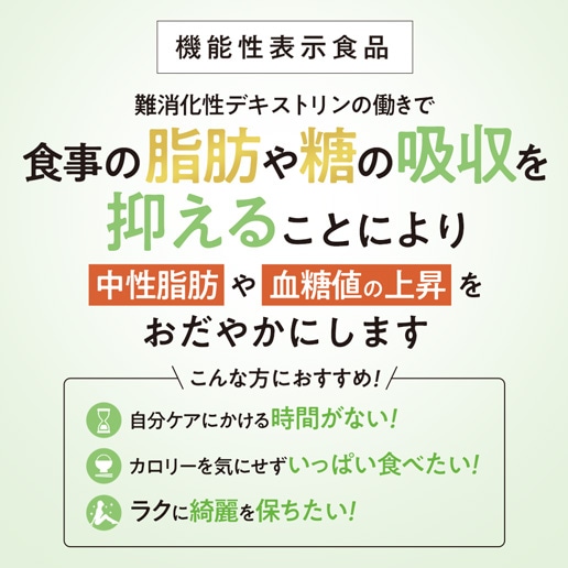 | 届け出表示 | 本品には難消化性デキストリン(食物繊維)が含まれています。難消化性デキストリン(食物繊維)には、食事から摂取した脂肪や糖の吸収を抑えることにより、食後の血中中性脂肪や血糖値の上昇を抑えることが報告されています。 本品は、事業者の責任において特定の保健の目的が期待できる旨を表示するものとして、消費者庁長官に届出されたものです。ただし、特定保健用食品と異なり、消費者庁長官による個別審査を受けたものではありません。 |
