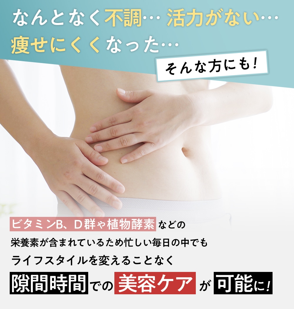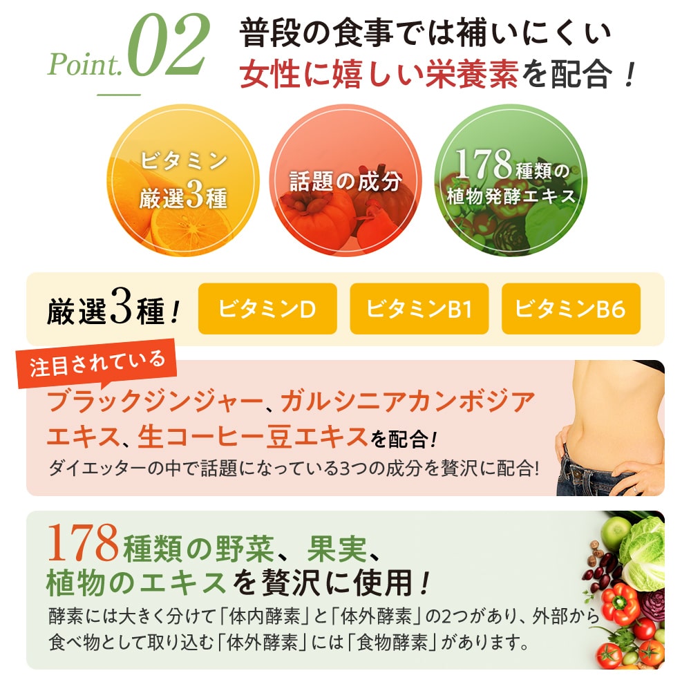 | 原材料名 | 難消化性デキストリン(食物繊維)(アメリカ製造)、植物発酵エキス(糖蜜、黒砂糖、オリゴ糖、その他)(卵・大豆・バナナ・やまいも・りんごを含む)、ガルシニアカンボジアエキス粉末、生コーヒー豆エキス粉末、ブラックジンジャー抽出物(ブラックジンジャーエキス、デキストリン)/ゲル化剤(増粘多糖類)、pH調整剤、香料、甘味料(ステビア)、シクロデキストリン、V.B6、V.B1、V.D |