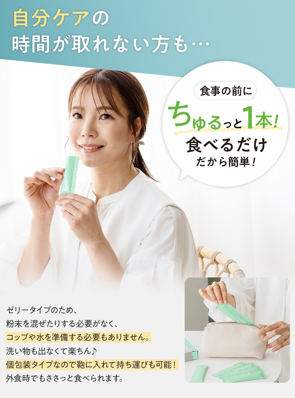 | 摂取方法及び1日あたりの摂取目安 | 食事前を目安に、 1本(20g)を召し上がりください。 |