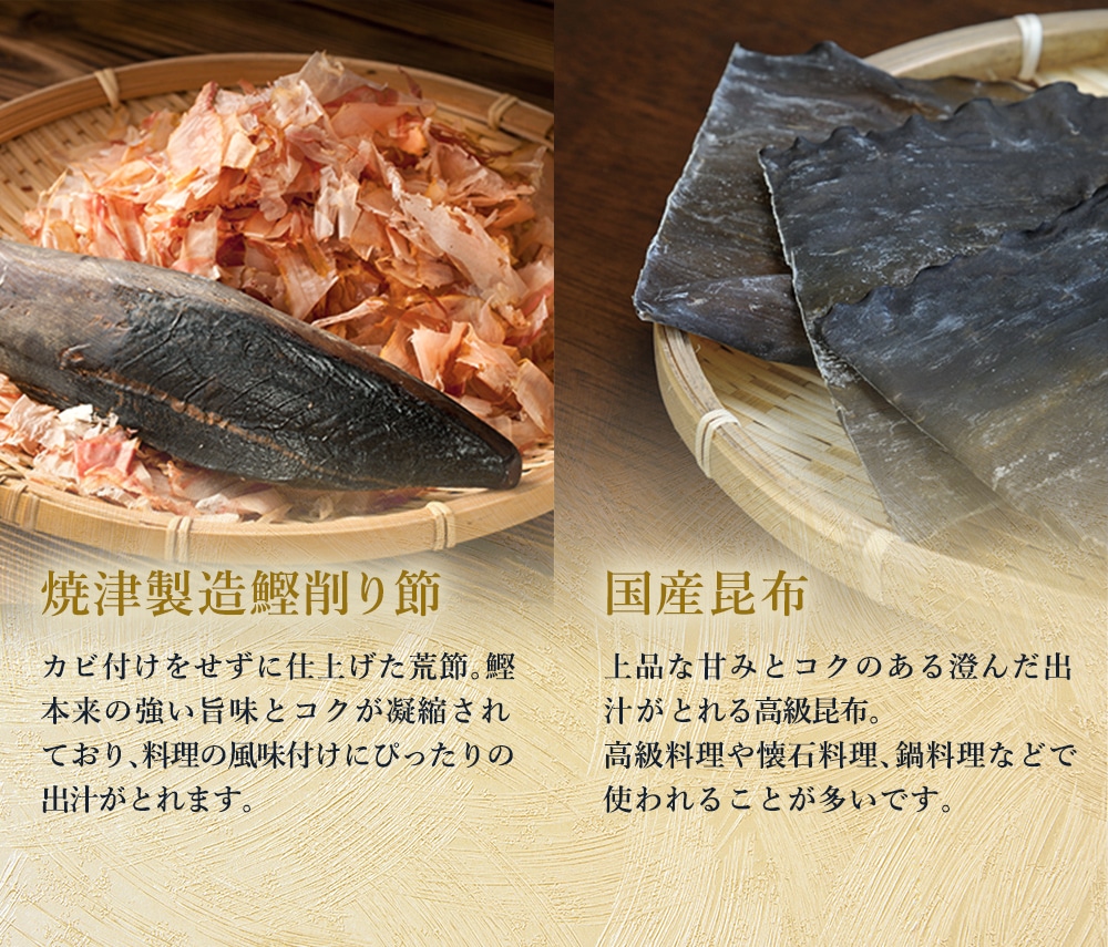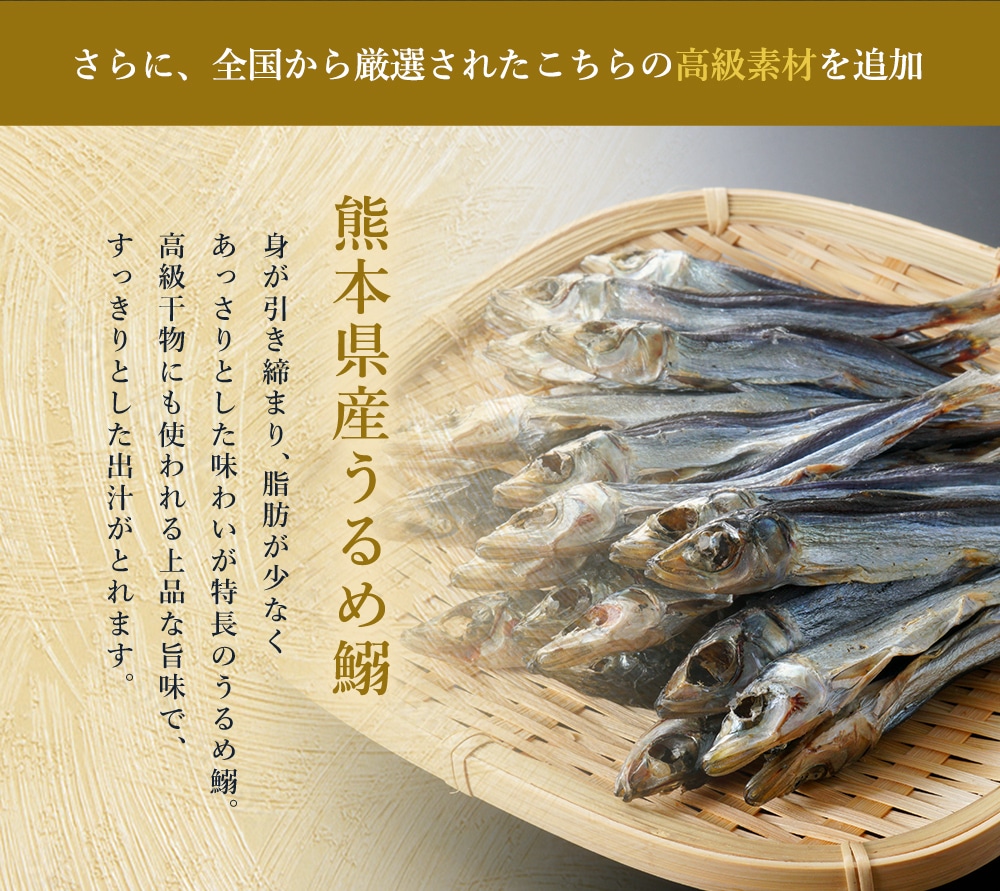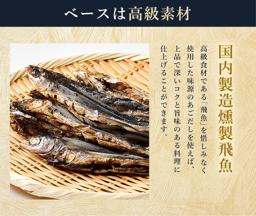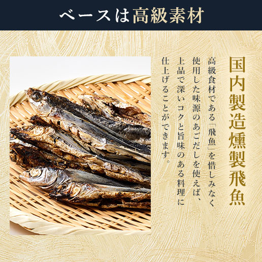 | 原材料名 | 食塩(国内製造)、砂糖、飛魚粉末、煮干うるめ鰯粉末、鰹削り節粉末、粉末醤油、鯖節粉末、酵母エキス、昆布粒、椎茸粉末、食用植物油脂/調味料(アミノ酸等)、(一部に小麦・さば・大豆を含む) |