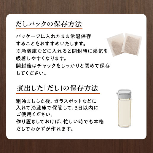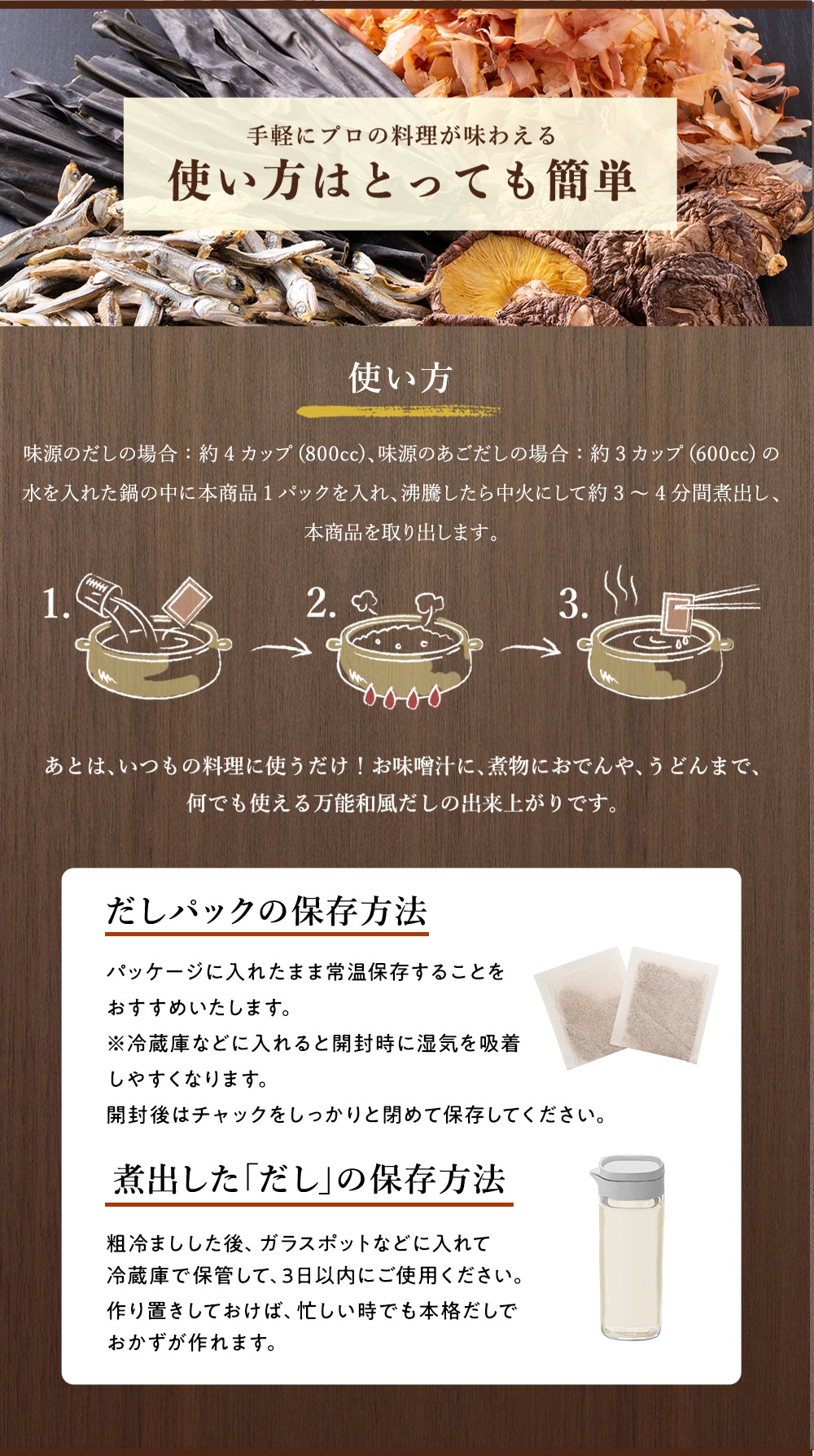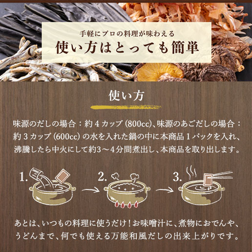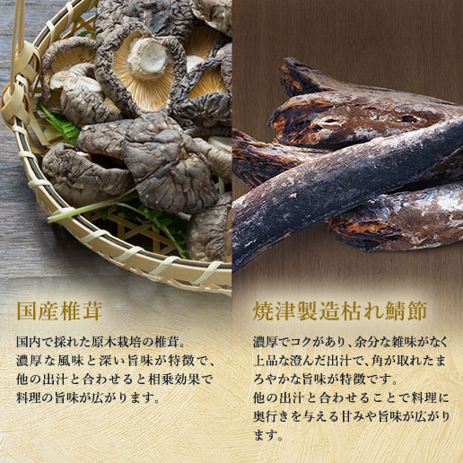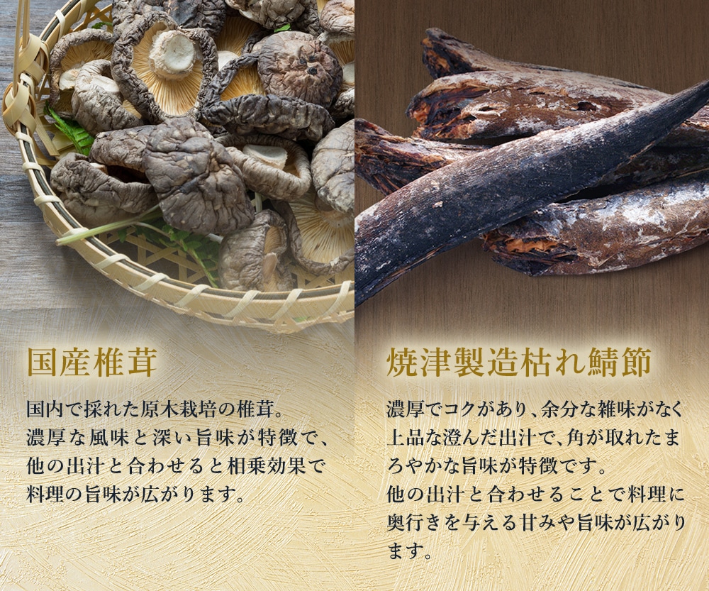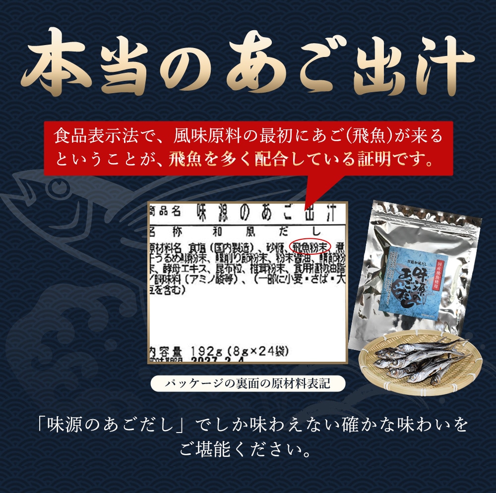 | 原材料名 | 食塩(国内製造)、砂糖、飛魚粉末、煮干うるめ鰯粉末、鰹削り節粉末、粉末醤油、鯖節粉末、酵母エキス、昆布粒、椎茸粉末、食用植物油脂/調味料(アミノ酸等)、(一部に小麦・さば・大豆を含む) |