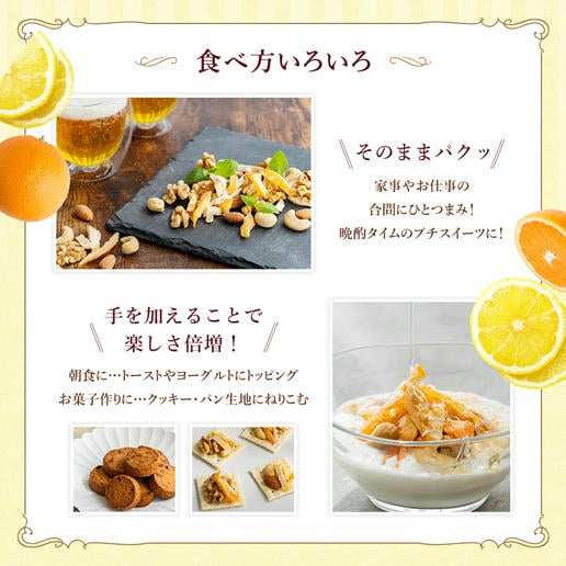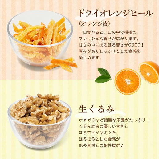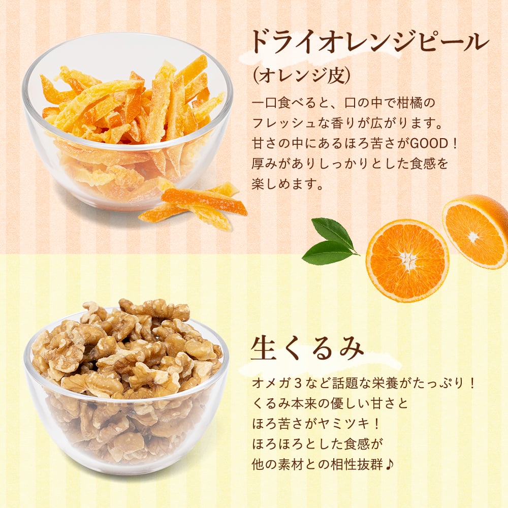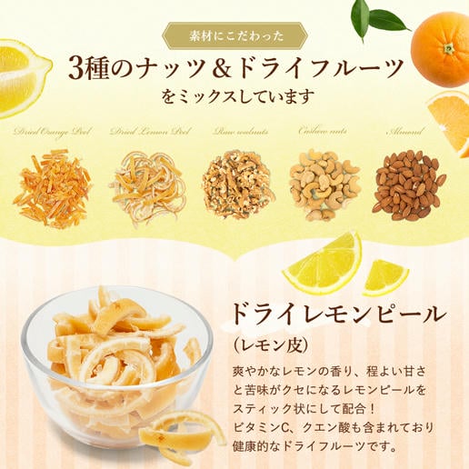 | 原材料名 | アーモンド(アメリカ)、くるみ、カシューナッツ、ドライオレンジピール(オレンジ皮、砂糖)、ドライレモンピール(レモン皮、砂糖)/酸味料、保存料(亜硫酸塩) |