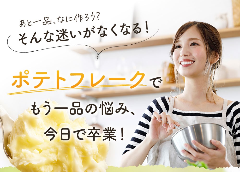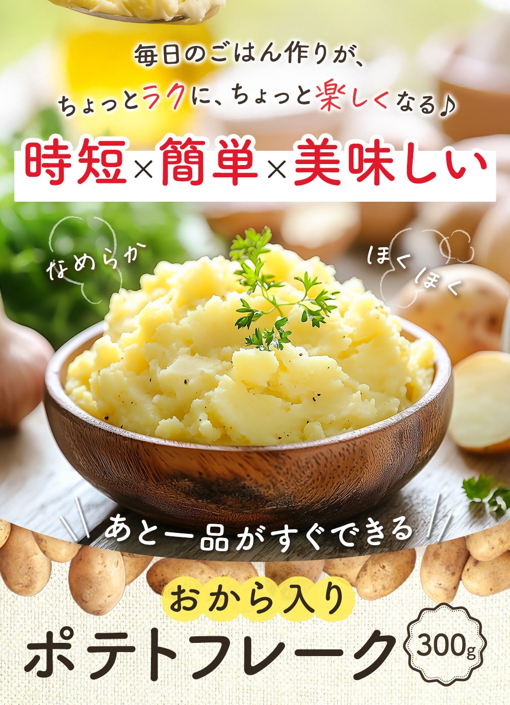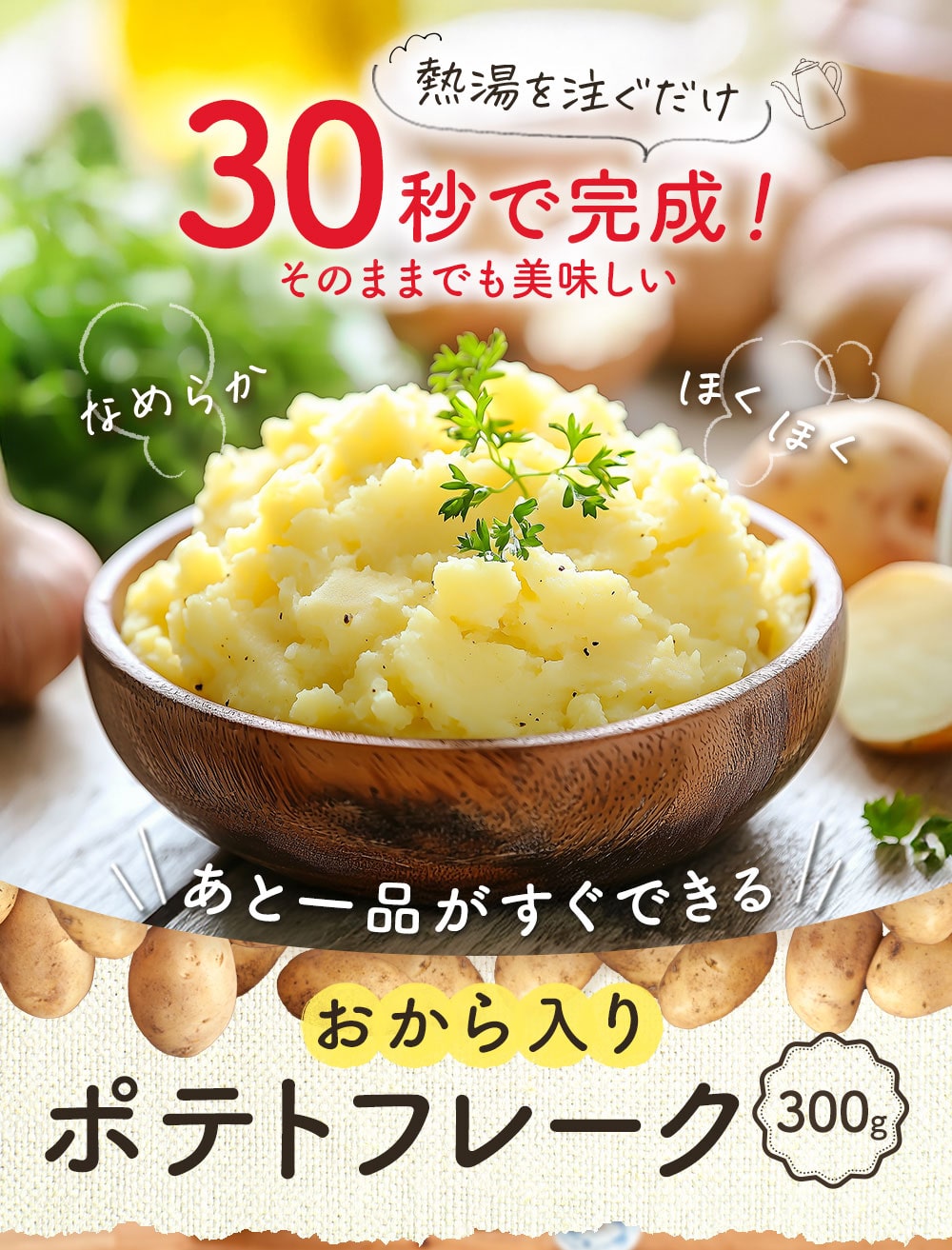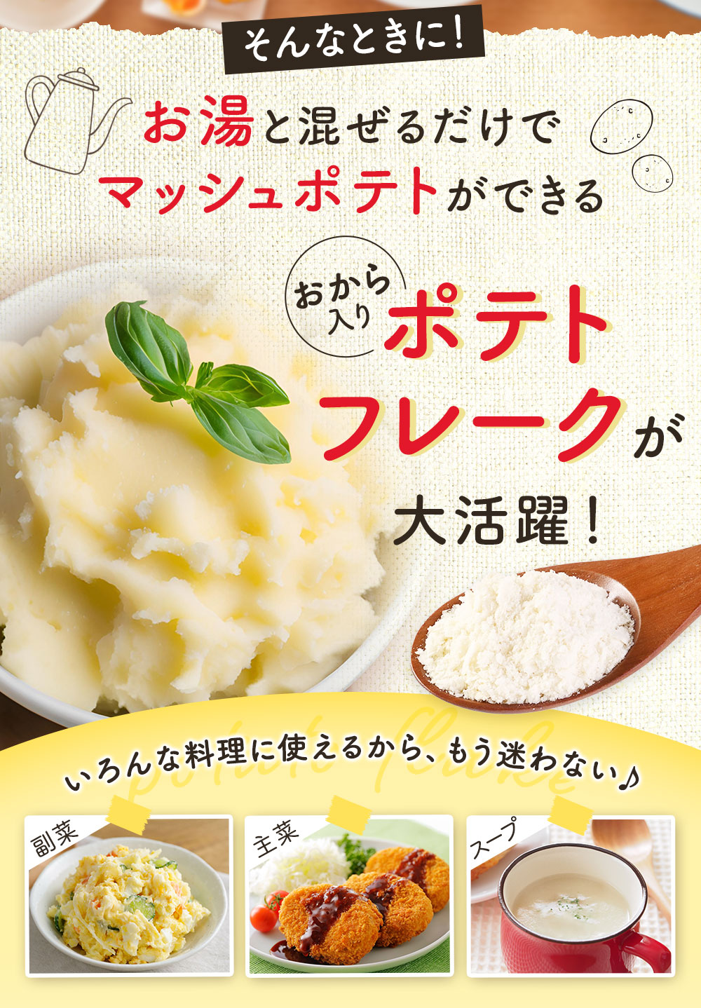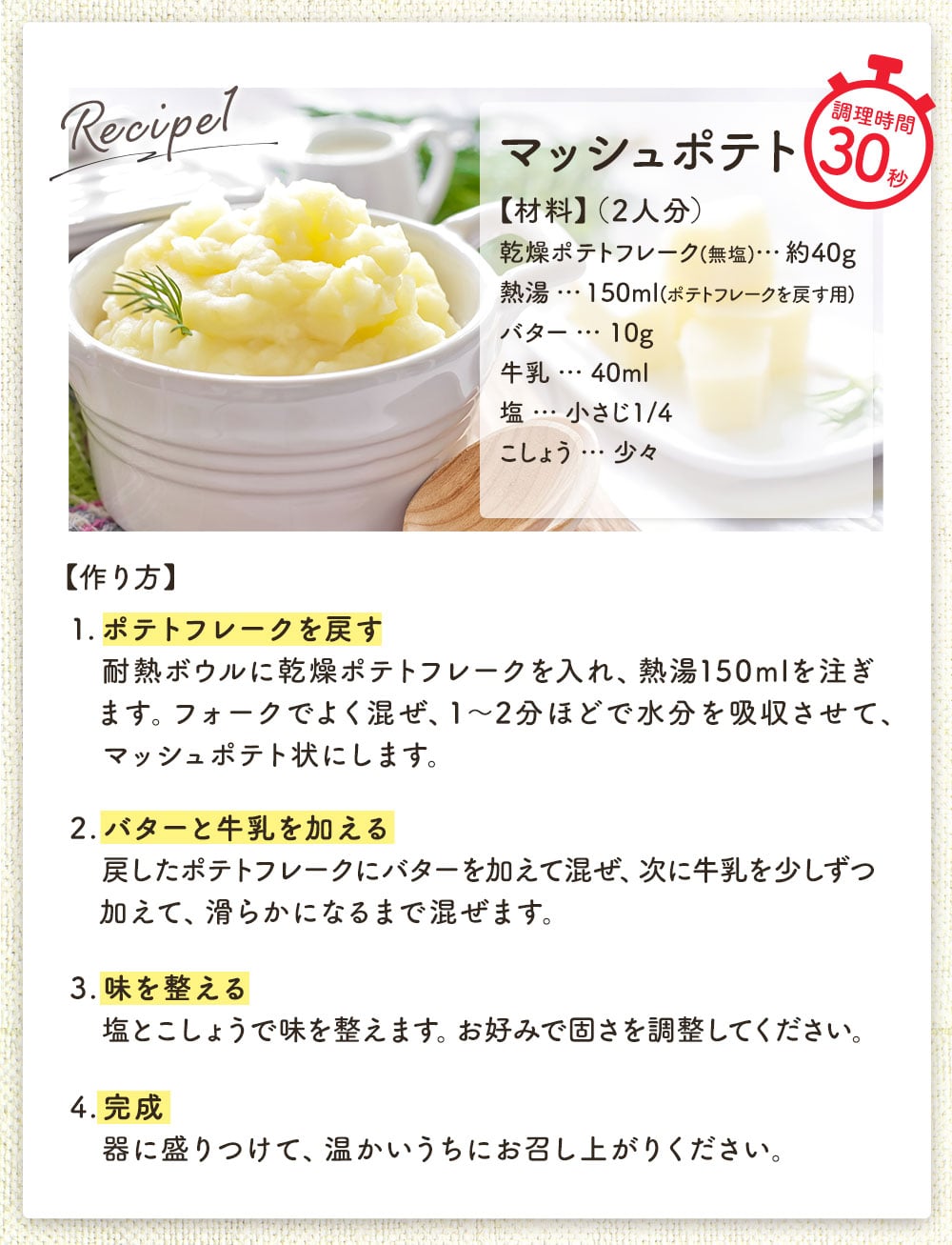 | 召し上がり方 | <マッシュポテトの作り方> ポテトフレーク1に対し、約80℃のお湯4を加え30秒程混ぜます。2分程度蒸らすと美味しい裏ごしポテトができあがります。 ※用途により、お湯の量を加減してください。 ※調理時のやけどにご注意ください。 |
