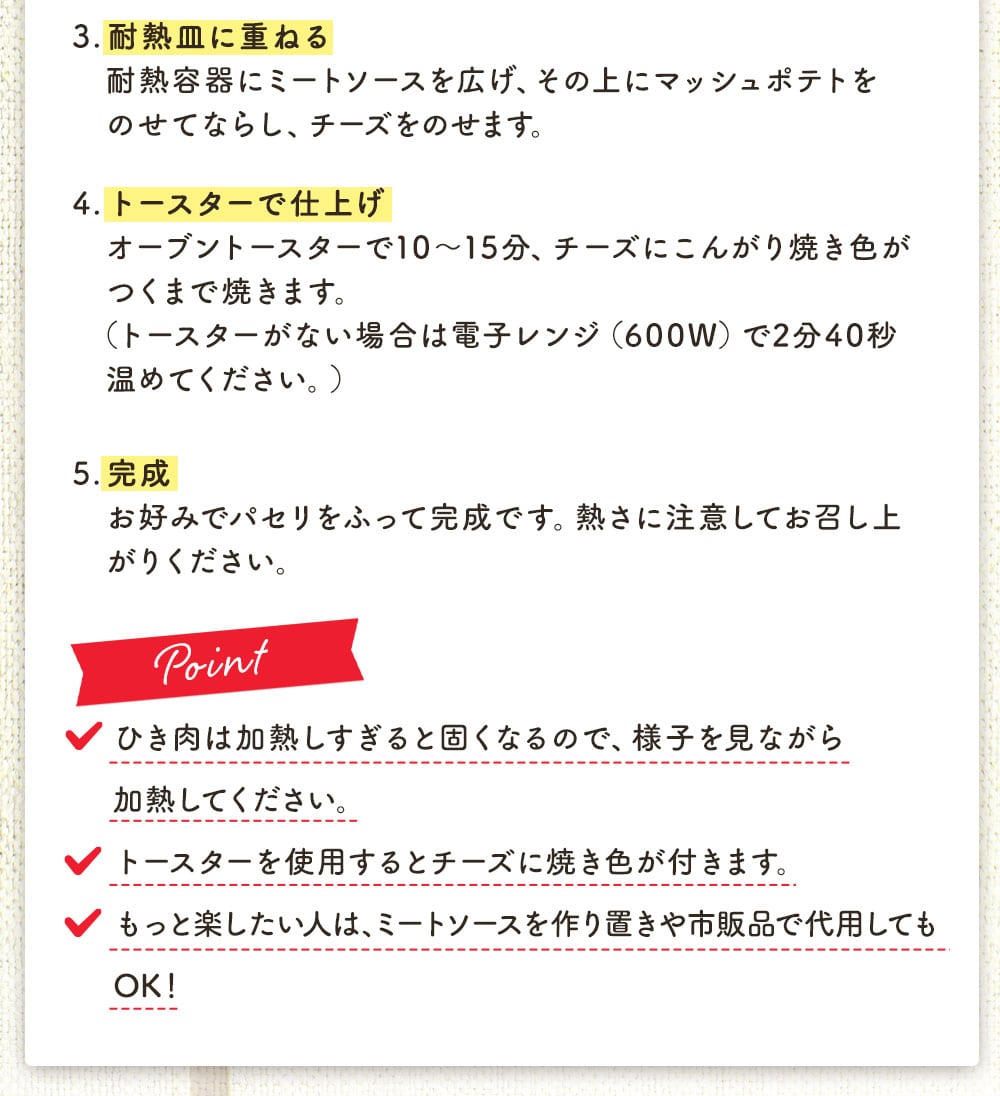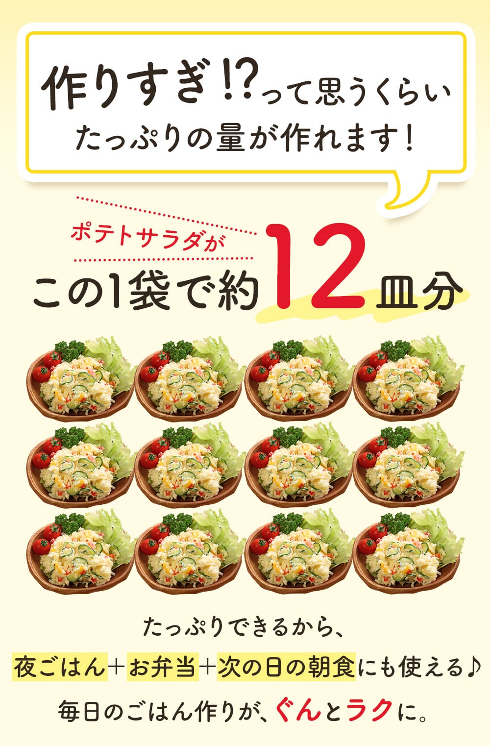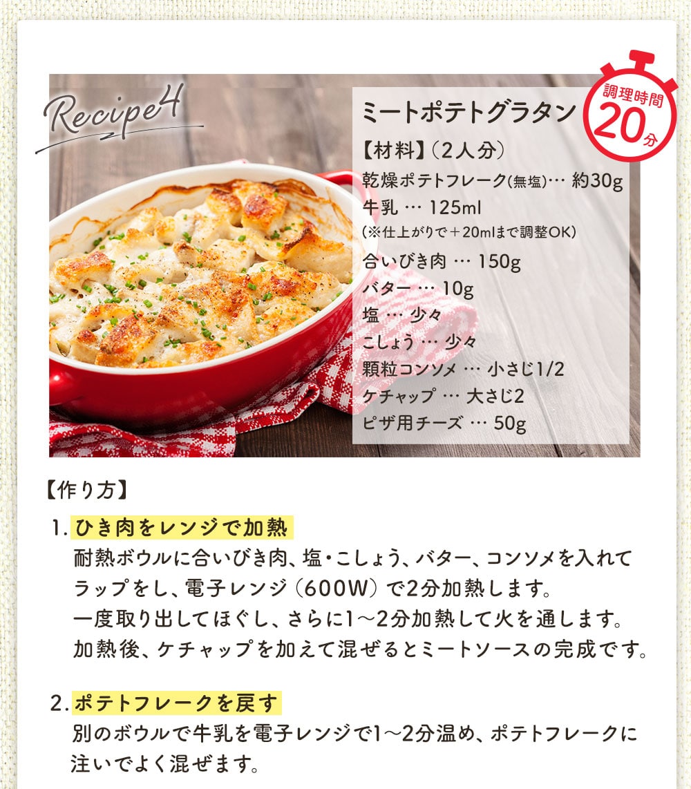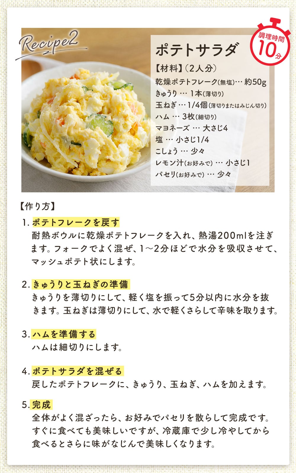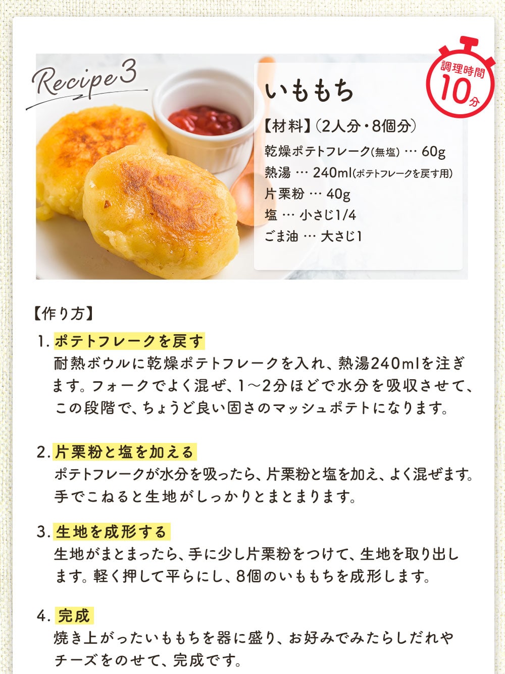 | 召し上がり方 | <マッシュポテトの作り方> ポテトフレーク1に対し、約80℃のお湯4を加え30秒程混ぜます。2分程度蒸らすと美味しい裏ごしポテトができあがります。 ※用途により、お湯の量を加減してください。 ※調理時のやけどにご注意ください。 |