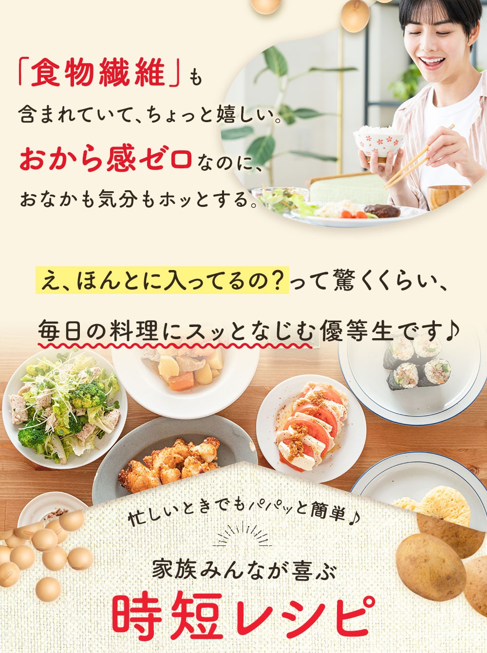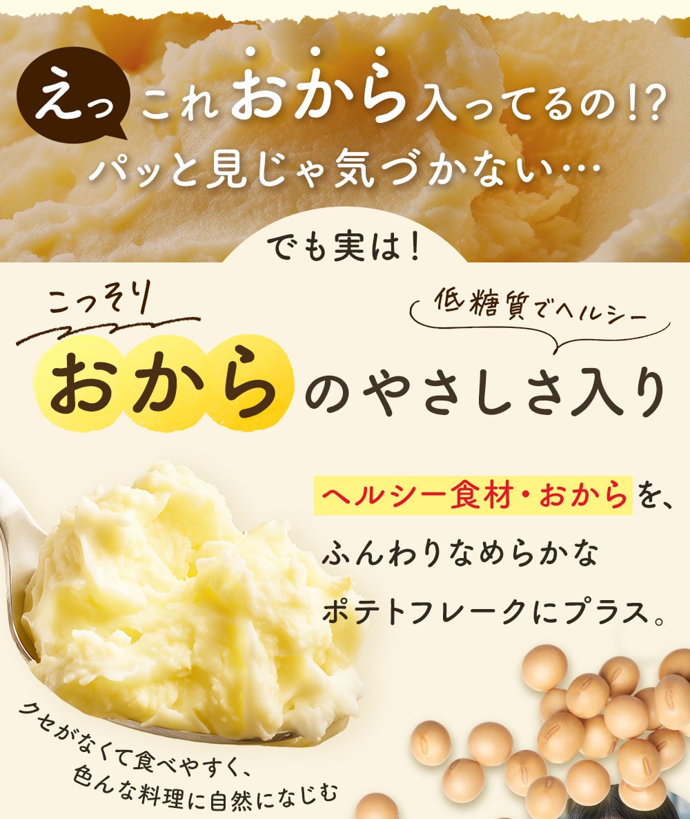 | 原材料名 | おからパウダー(大豆を含む)(国内製造)、ポテトフレーク(アメリカ産)/乳化剤、ピロリン酸Na、pH調整剤 |