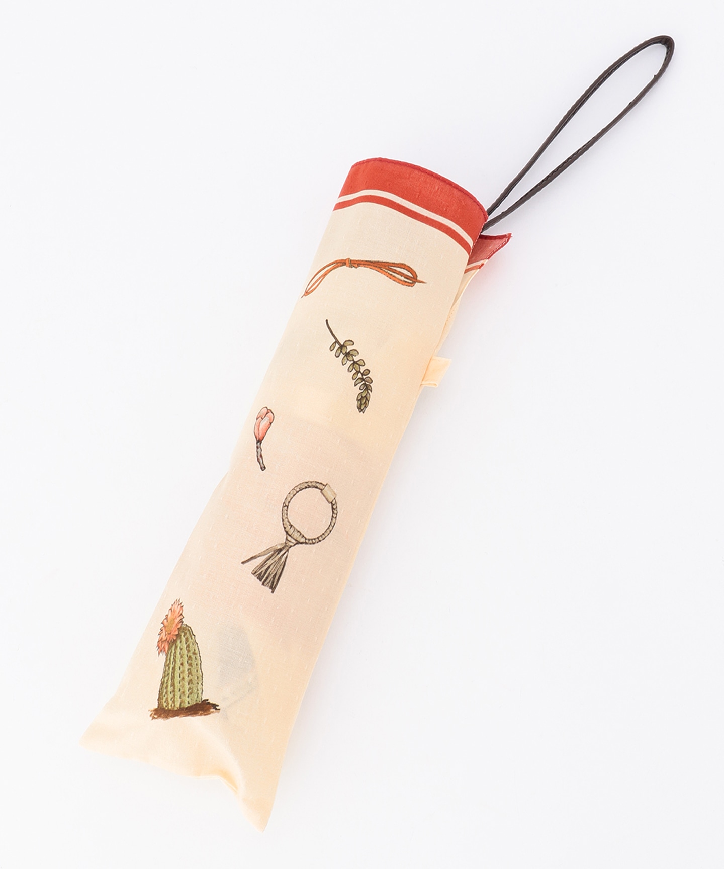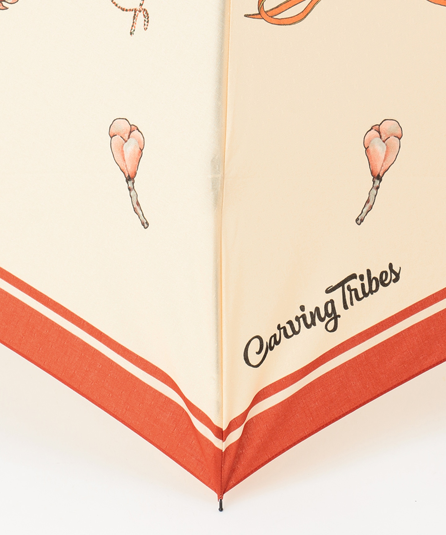 Carving Tribesのロゴと共に、Maestraバッグなど、メキシコに因んだ図案を用いたオリジナル柄を散りばめた折り畳み傘。