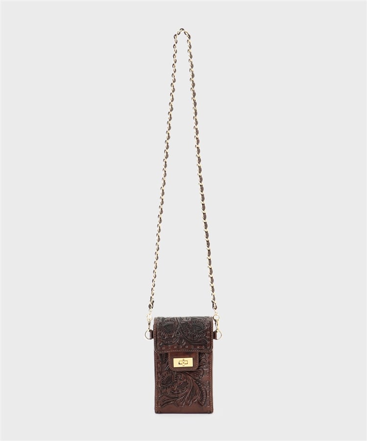 柄を活かした上質な牛革に、レザーを巻きつけたゴールドのチェーンストラップが品の良いアクセントに。