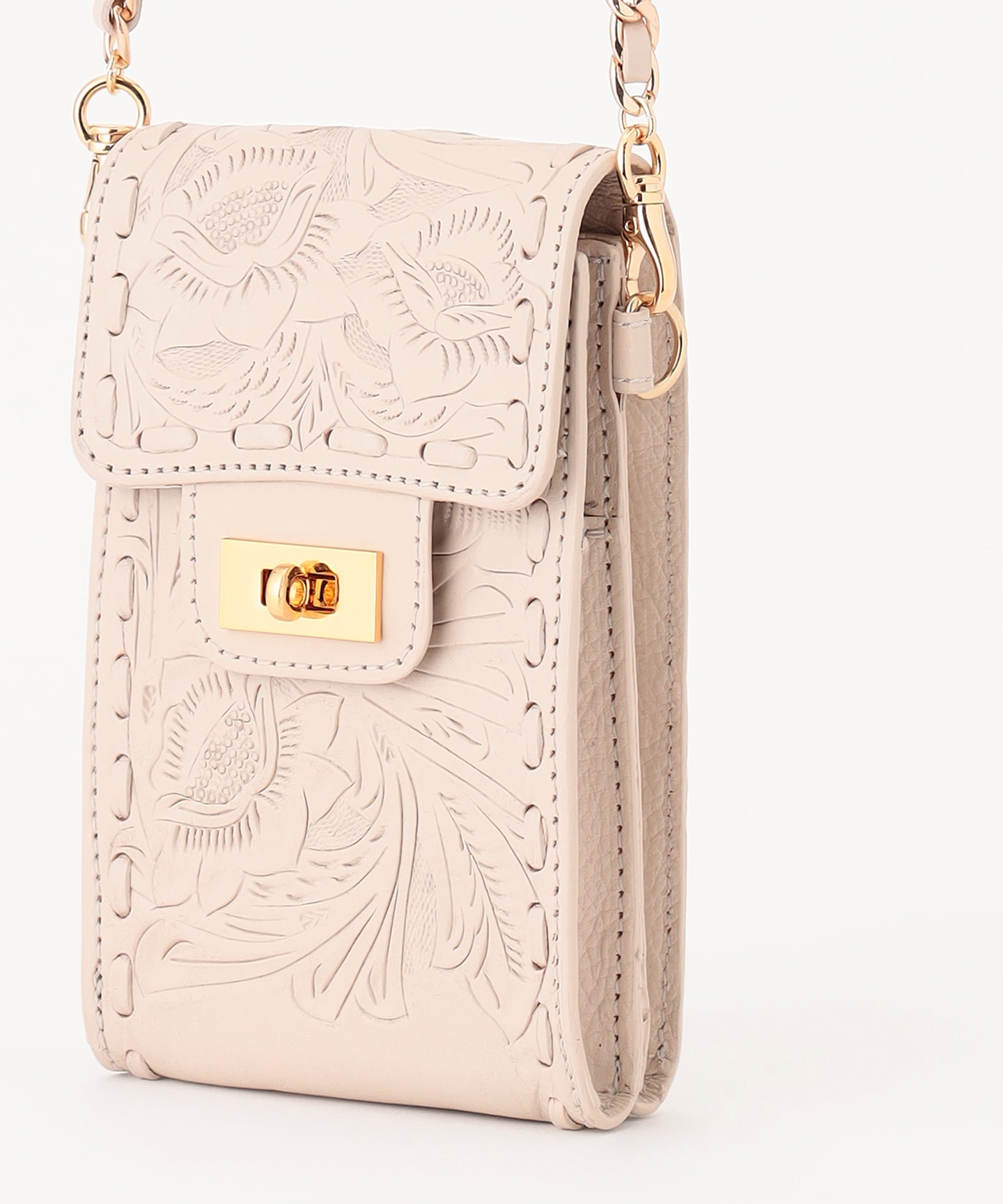 柄を活かした上質な牛革に、レザーを巻きつけたゴールドのチェーンストラップが品の良いアクセントに。