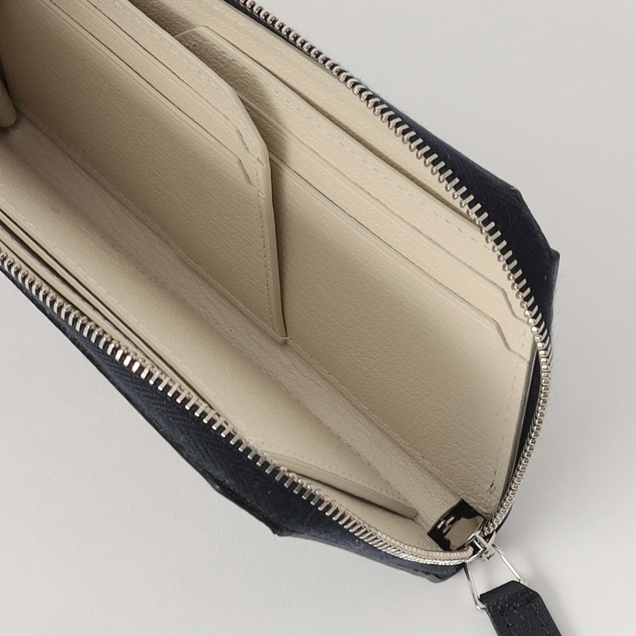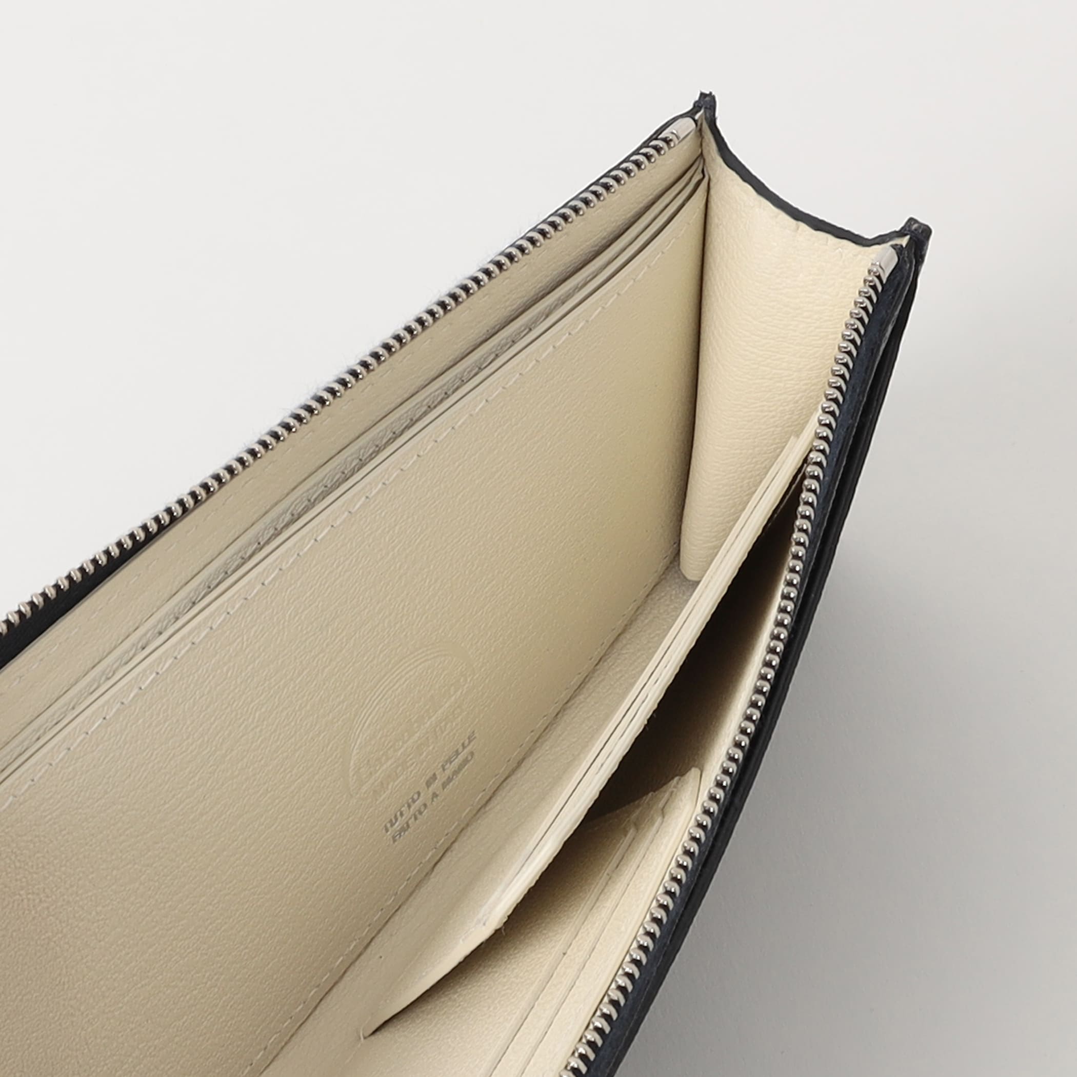 一般的な長財布のカード入れを交差して重ねることで、収納性はそのままにサイズを一回り小さく。