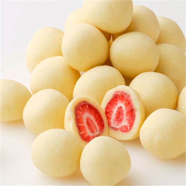 サクッとした歯ごたえとともに、白いチョコレートの中から真っ赤な乾燥苺が顔を出します。白と赤の鮮やかなコントラストが目を引くチョコレート菓子。フリーズドライ苺の酸味とホワイトチョコレートの甘みが絶妙な組み合わせです。