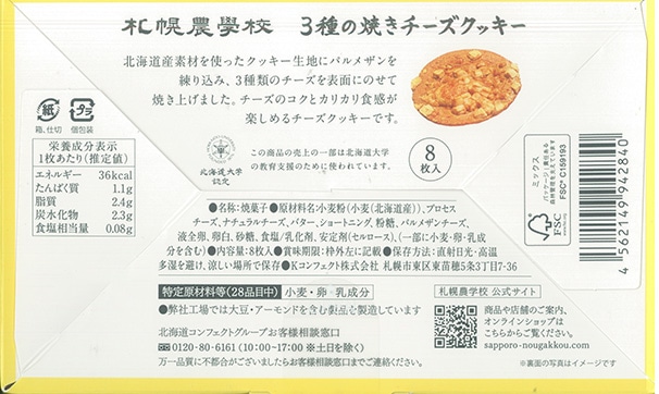原材料:小麦粉(小麦(北海道産))、プロセスチーズ、ナチュラルチーズ、バター、ショートニング、粉糖、パルメザンチーズ、液全卵、卵白、砂糖、食塩/乳化剤、安定剤(セルロース)、(一部に小麦・卵・乳成分を含む)
