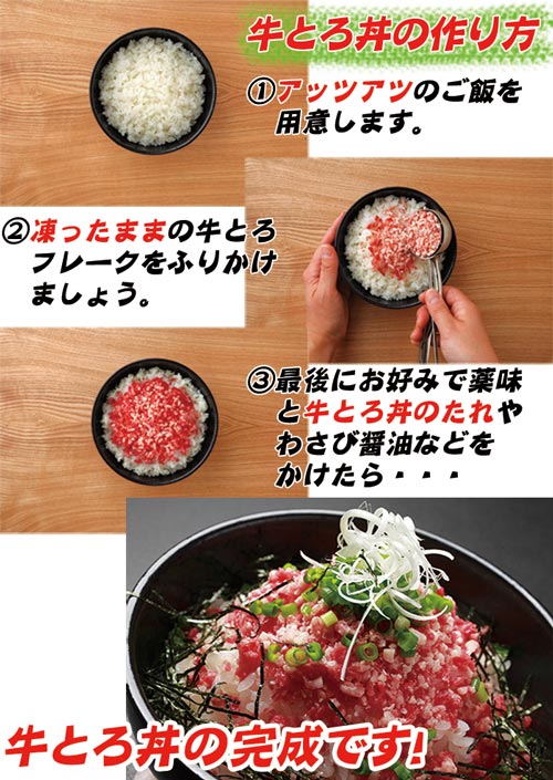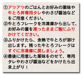 凍ったままアツアツご飯にふりかけるだけ。牛肉本来の旨みと、とろけるような食感をお楽しみください。