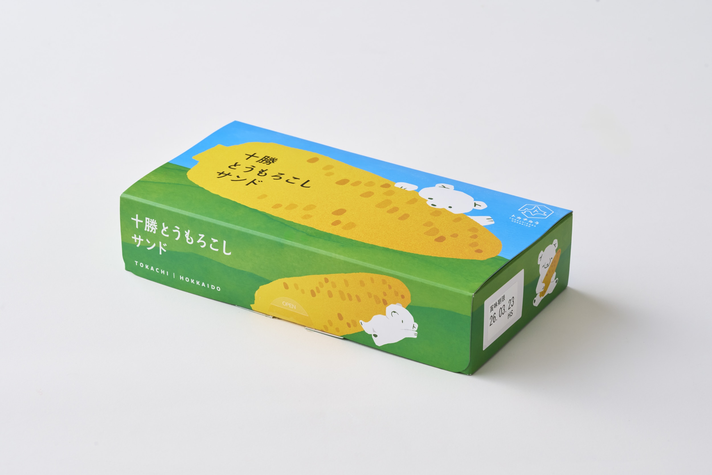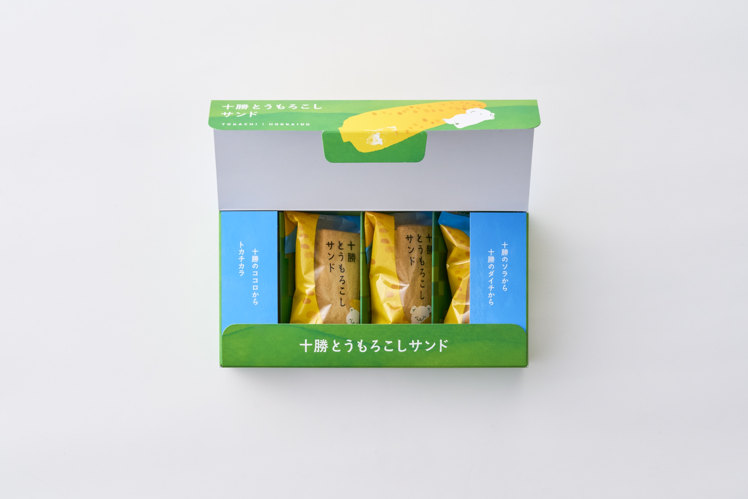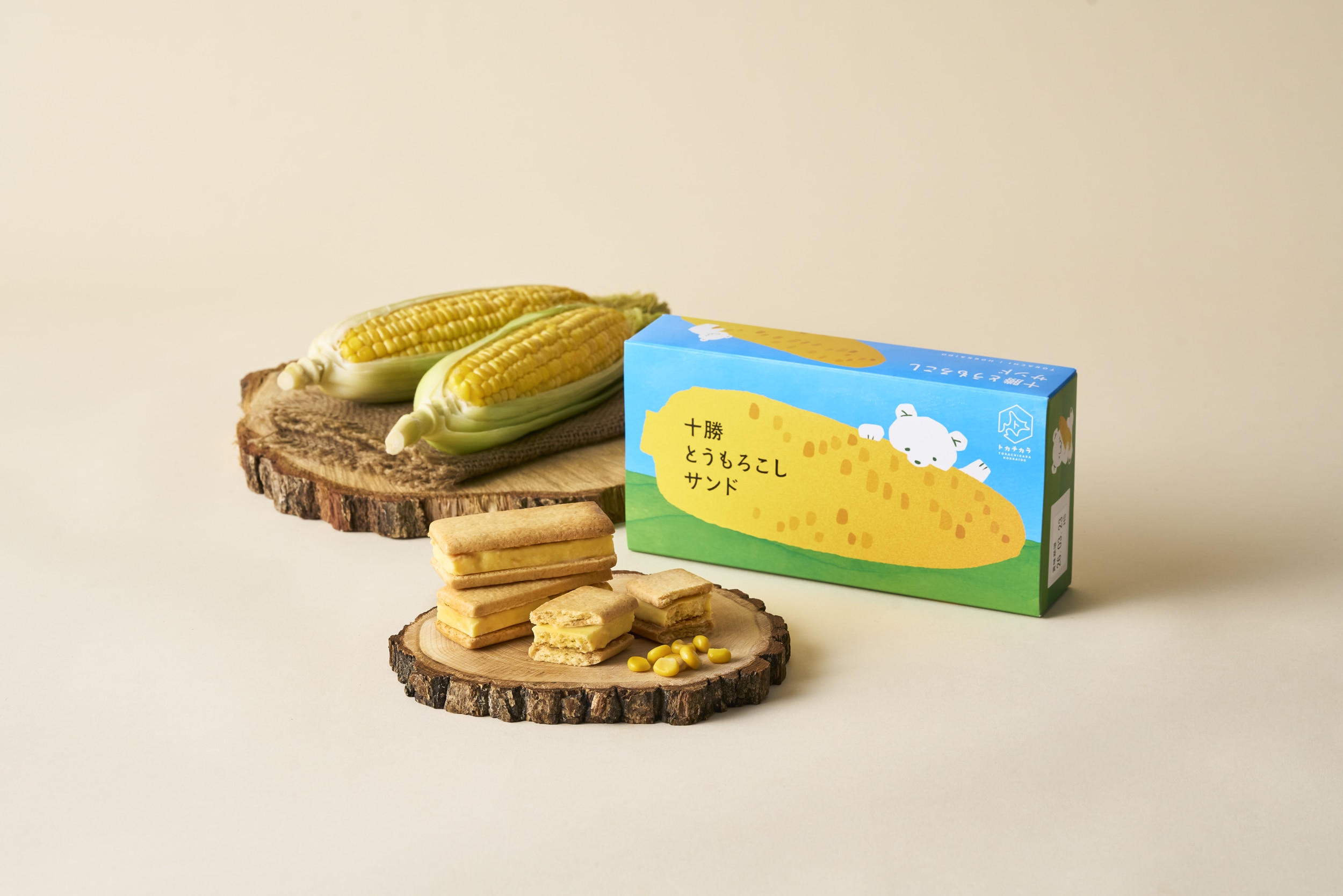 十勝産とうもろこし入りのケーキをチョコレートコーチングで包み込みクッキーでサンド。