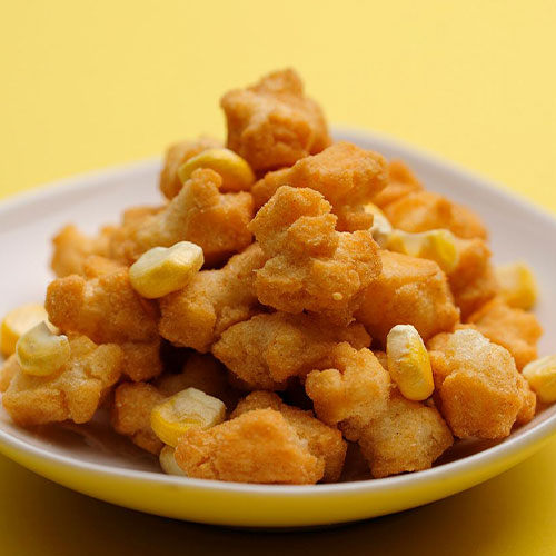 原材料: 水稲もち米(日本)、植物油脂、乾燥スイートコーン、スイートコーンパウダー、ローストコーンシーズニング、調味料(アミノ酸等)、香料、カラメル色素、甘味料(スクラロース)、酸味料、(原材料の一部にえび、小麦、大豆、鶏肉を含む)