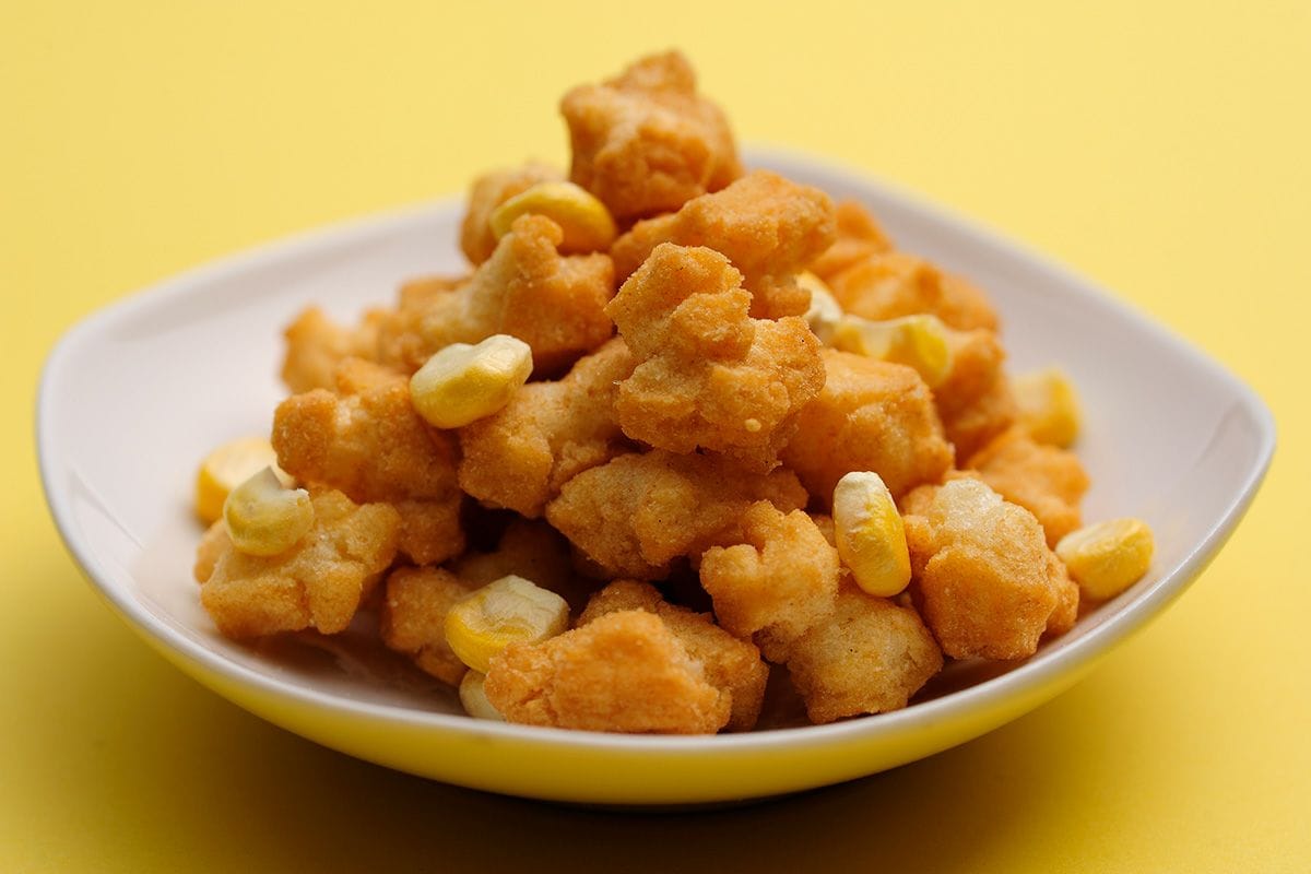 原材料: 水稲もち米(日本)、植物油脂、乾燥スイートコーン、スイートコーンパウダー、ローストコーンシーズニング、調味料(アミノ酸等)、香料、カラメル色素、甘味料(スクラロース)、酸味料、(原材料の一部にえび、小麦、大豆、鶏肉を含む)