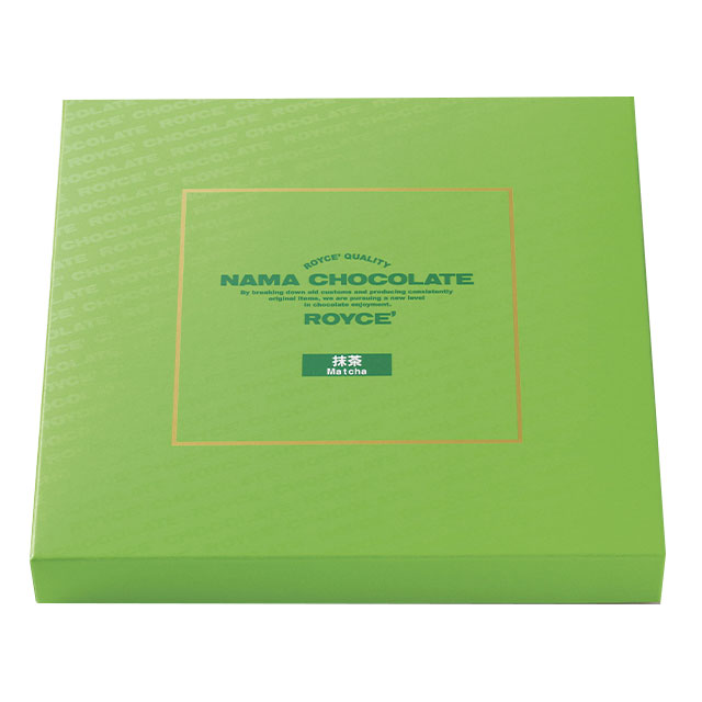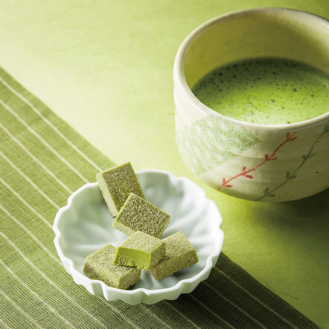 ホワイトチョコレートに、香り高い抹茶と生クリーム、風味付けの洋酒をブレンドしてつくった生チョコレート。