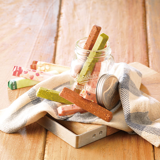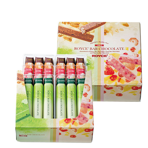 奥深い味わいのチョコレートと香ばしいナッツのハーモニーがたまらないナッティバーチョコレート、フルーツの風味とチョコレートのおいしさがとけ合うフルーツバーチョコレート、抹茶の豊かな香りとナッツのおいしさが調和する抹茶バーチョコレートを6本ずつ詰め合わせました。
