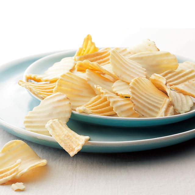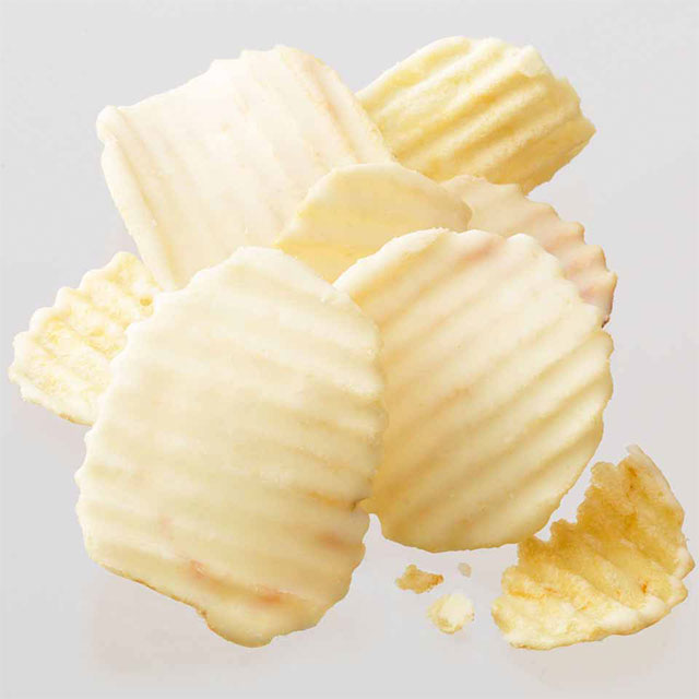 パリッと軽やかな食感のポテトチップの片面に、チーズの風味がほんのり香るホワイトチョコレートをかけました。