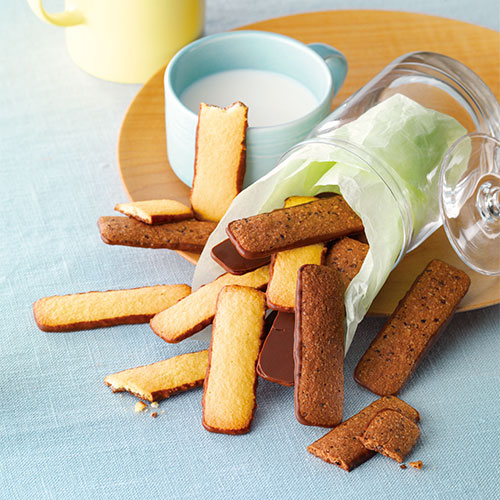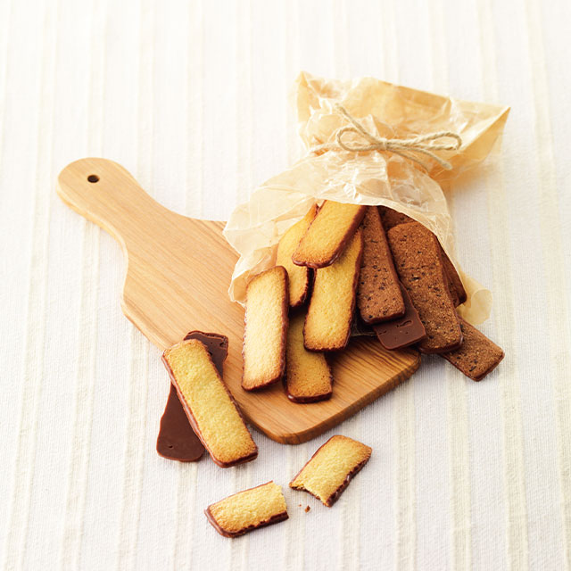さくさくのクッキーの片面にチョコレートをコーティングした、人気のバトンクッキー。ローストしたココナッツの香ばしさがたまらない[ココナッツ]と、ヘーゼルナッツの上品な香りとカカオ豆のほろ苦さが漂う[ヘーゼルカカオ]。2つのおいしさを一度にお楽しみいただける詰め合わせです。