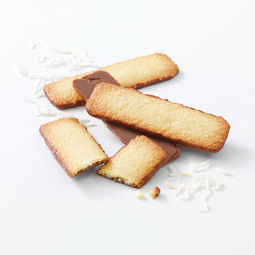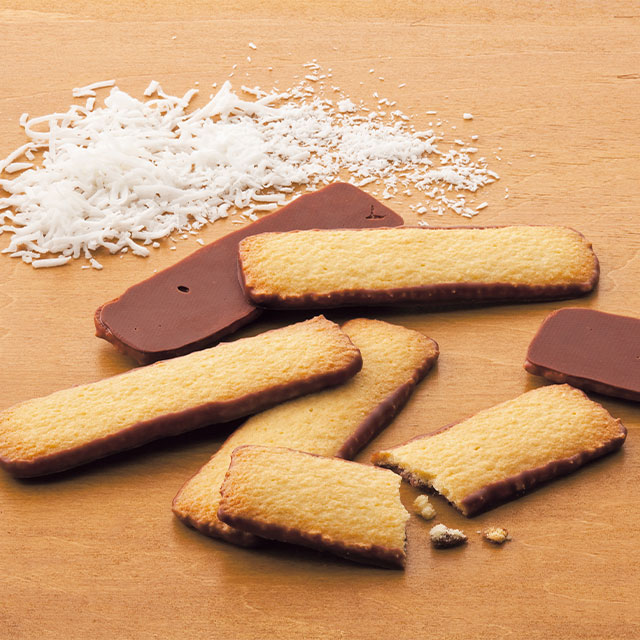 じっくりとローストしたココナッツを混ぜ、こんがりキツネ色に焼き上げたクッキー。片面にはチョコレートをコーティングしました。さくさくとした軽快な歯ごたえと、香ばしくまろやかな風味をお楽しみください。