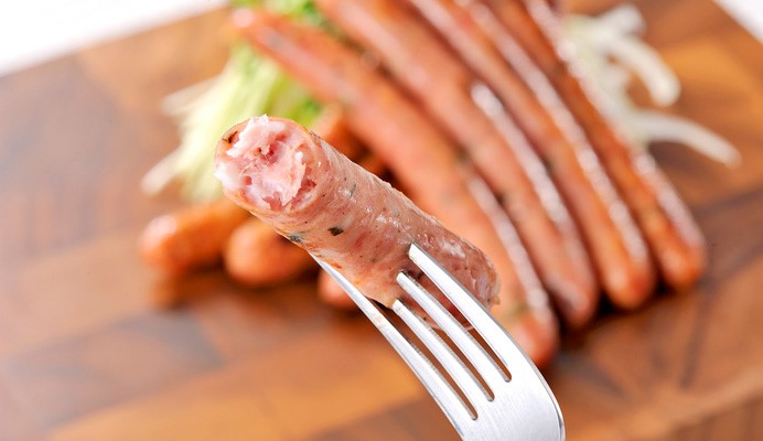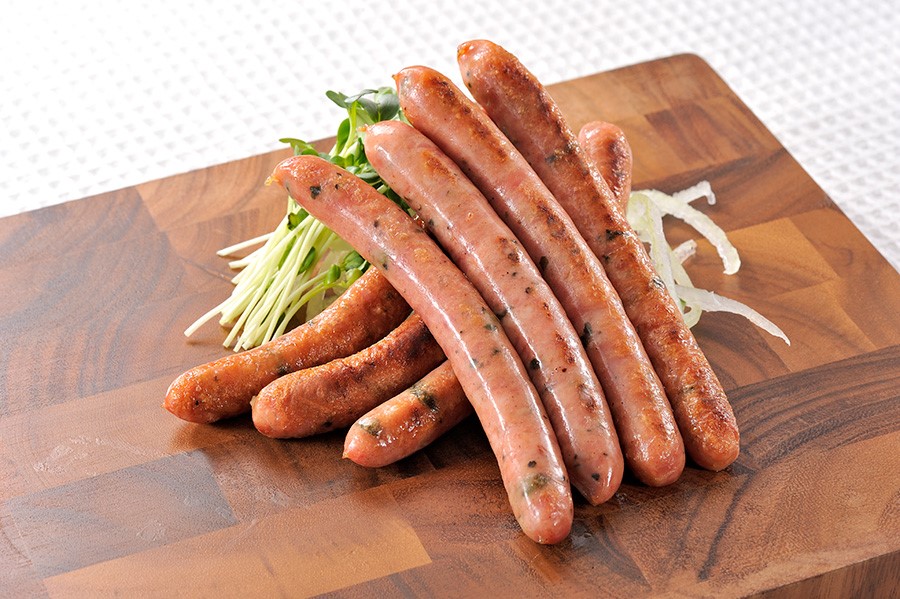 原材料: 豚肉、豚脂肪、香辛料、でん粉、食塩、えんどう豆たん白、砂糖/リン酸塩(Na)、保存料(ソルビン酸)、 調味料(アミノ酸)、酸化防止剤(ビタミンC)、発色剤(亜硝酸Na)、(一部に豚肉を含む)