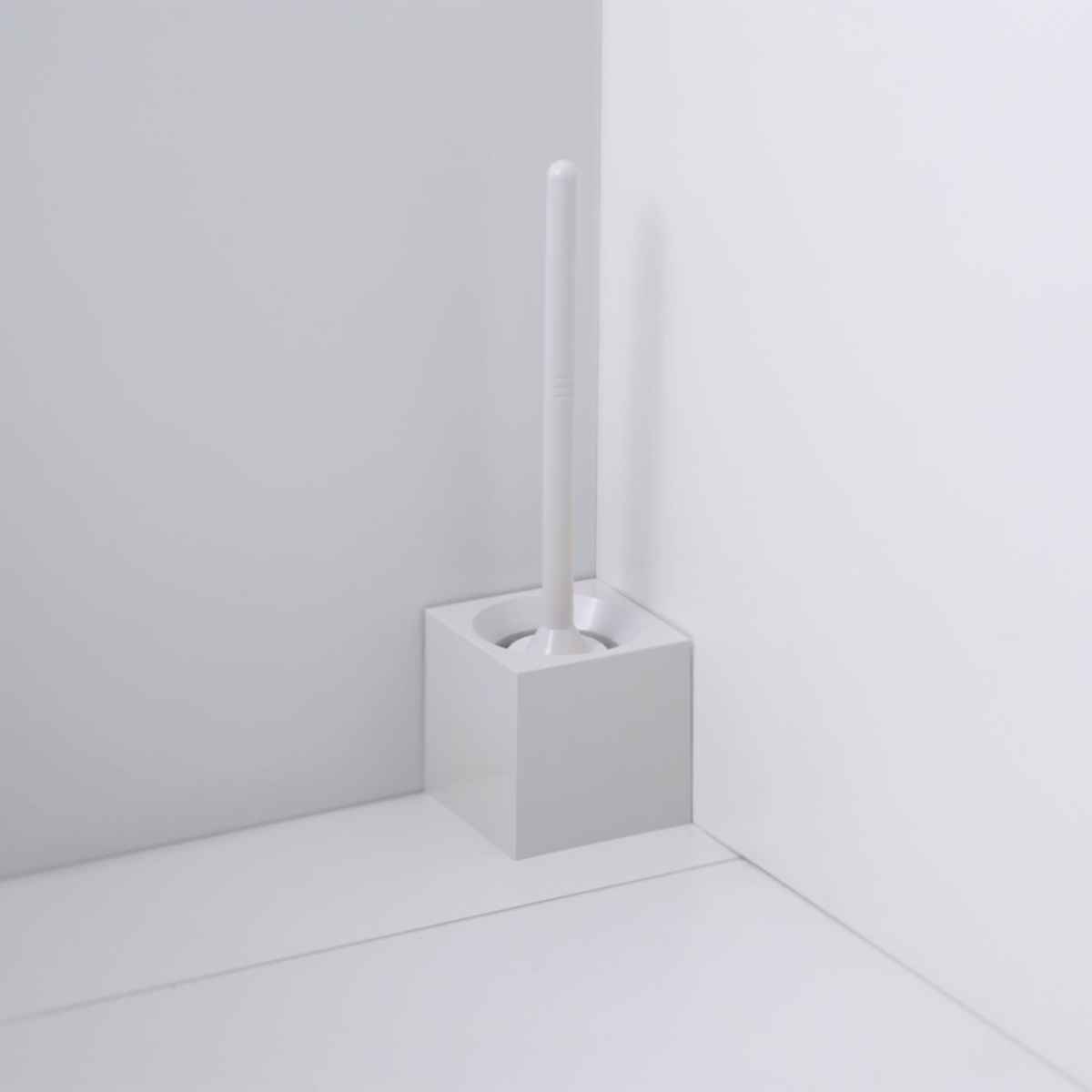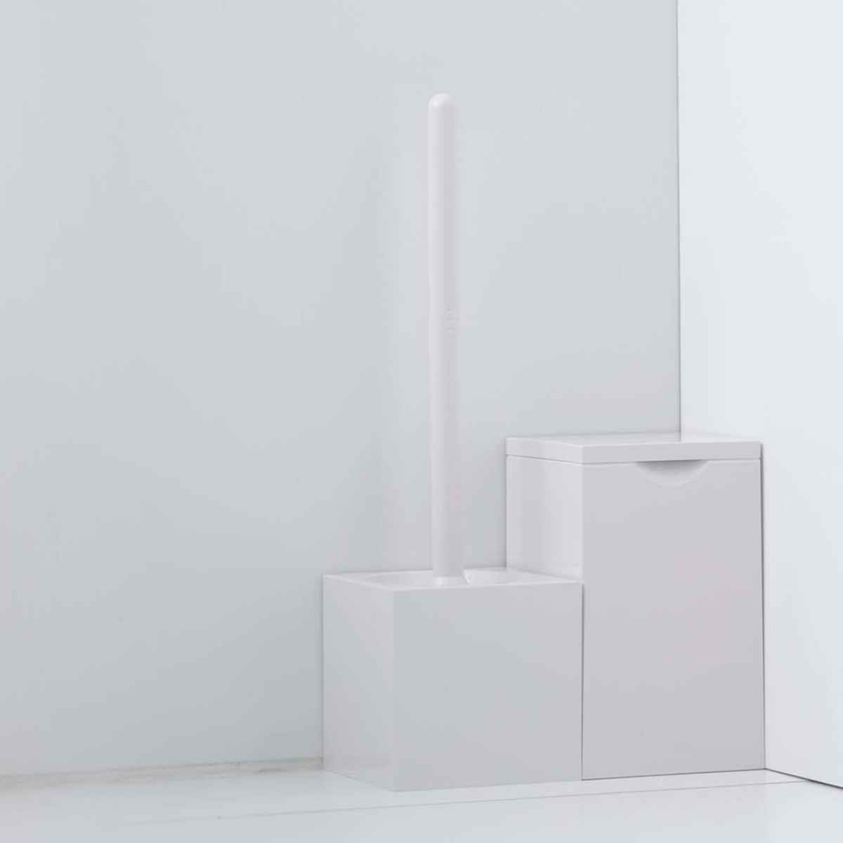 コーナーに適したスクエア型のケース付きトイレブラシです。シンプルで清潔感のあるホワイトがサニタリールームに馴染みます。収納時にはブラシが見えないよう工夫されており、すっきりとした佇まいでグッドデザイン賞に選ばれています。