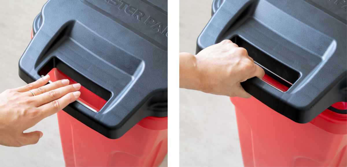 ふたをカチっと音がするまで奥に押すとロックが掛かるので、猫やカラスがイタズラをして開けてしまう心配がありません。ハンドルを握って片手で楽にロックを解除して頂く事ができます。