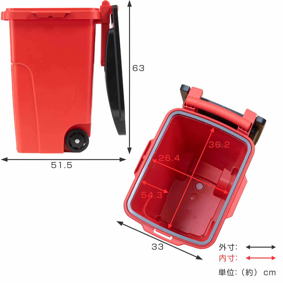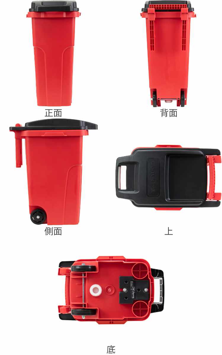 | 材質 | 本体・蓋・蓋ロック・ポリ袋止め・ホイール・ハンドル:PP 排水栓・重りカバー:PE 蓋パッキン:発泡PE 車輪軸・ネジ・ワッシャー・重り:スチール タイヤ:エラストマー |