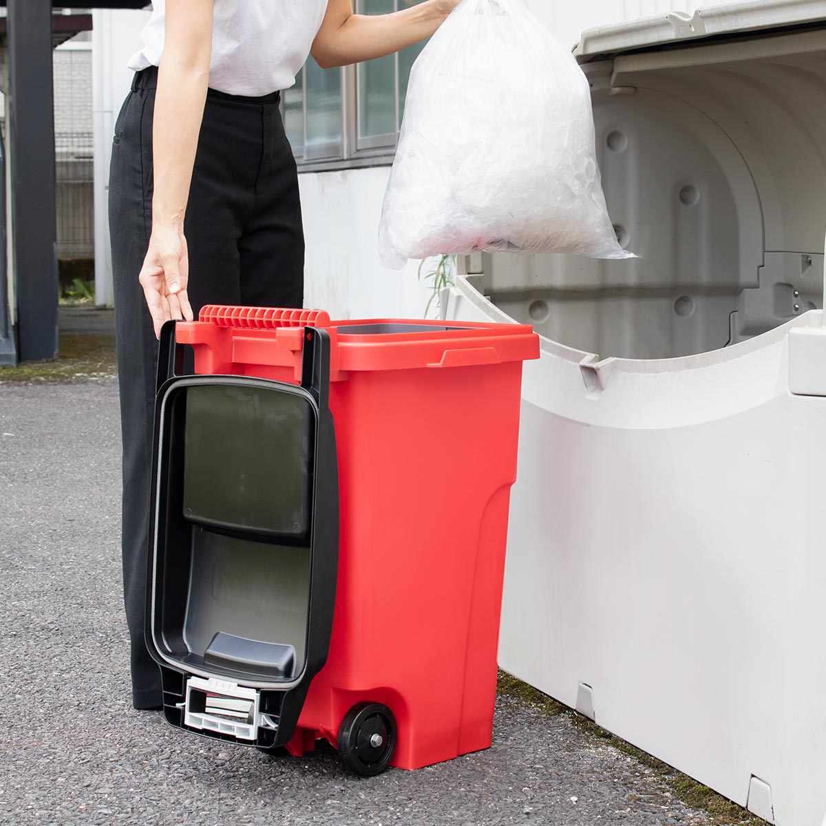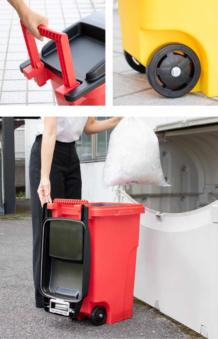 ゴミが溜まって重くなってしまっても、簡単に移動できるキャスター付きです。また、ハンドルを持ってゴミ収集場所まで楽に移動させる事ができます。ふたはフルオープンでゴミ袋の取り出しが簡単です。
