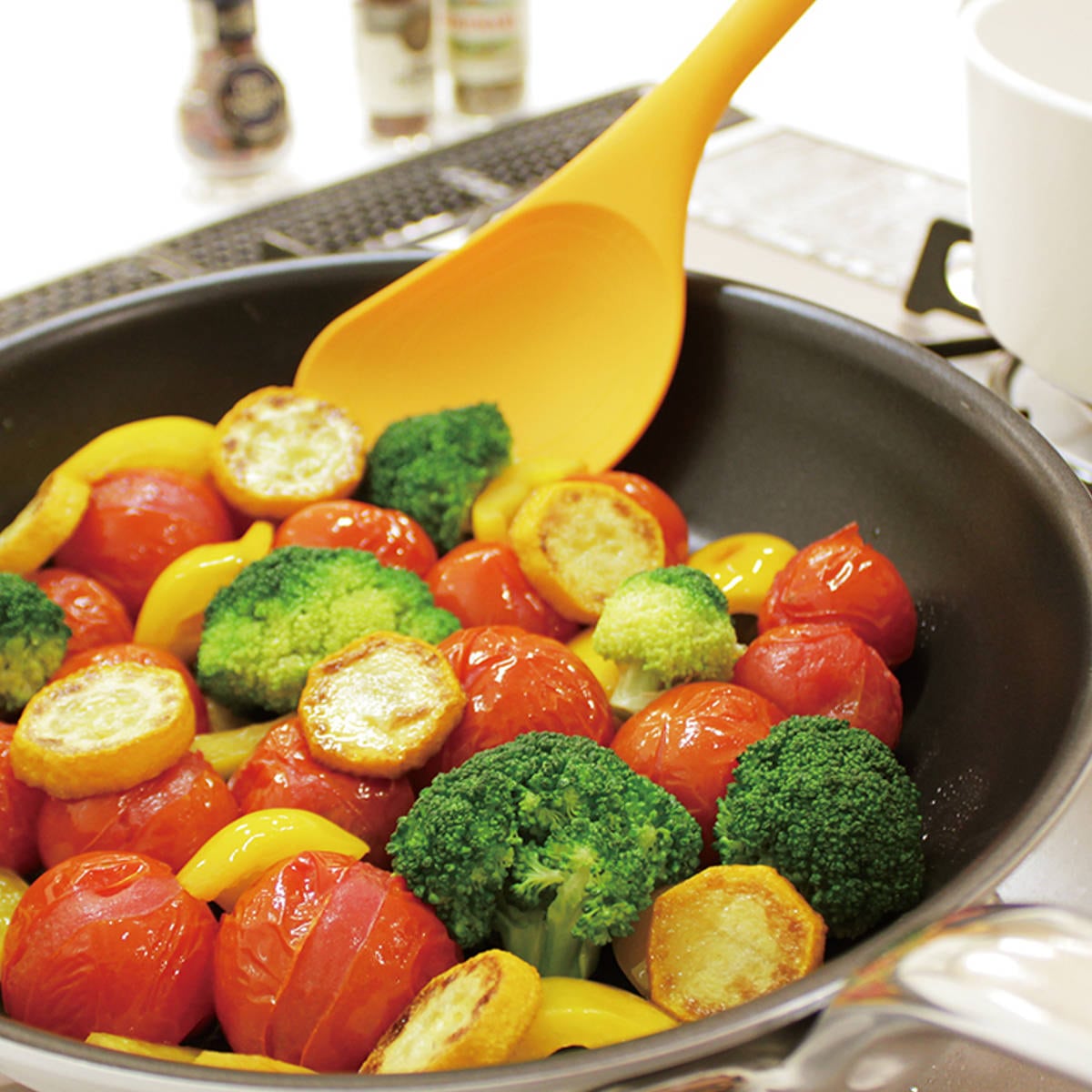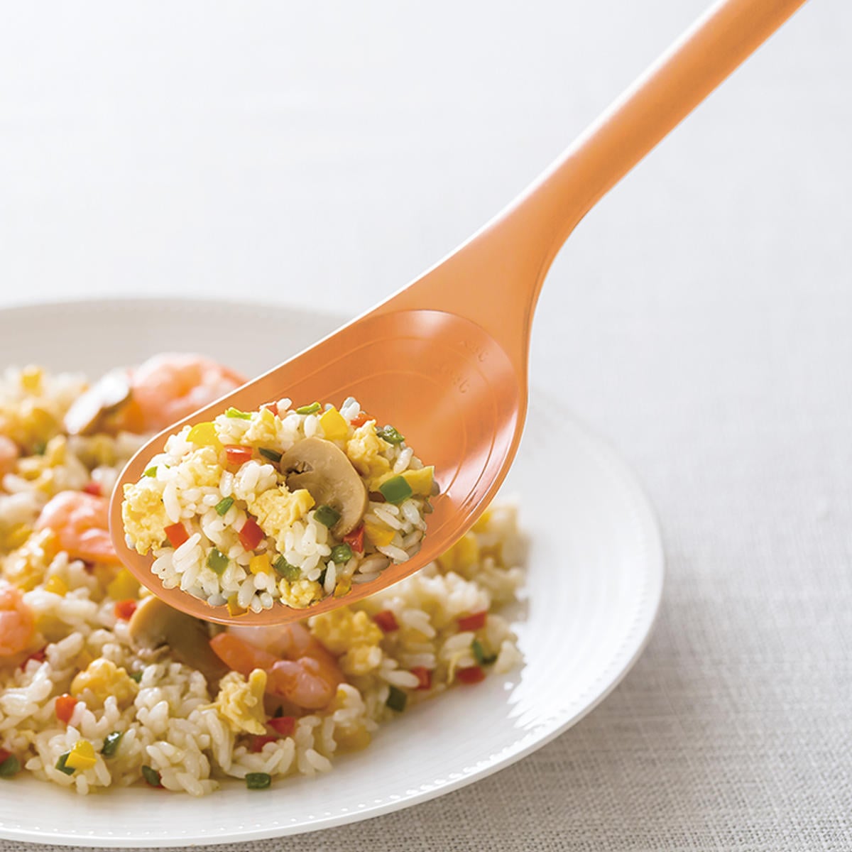 右利き用に特化して、フライパン調理でより炒めやすい角度と形状になりました。大さじ1・小さじ1の計量線付きで計量スプーンを出さずにサッと手早く調味料が量れます。
