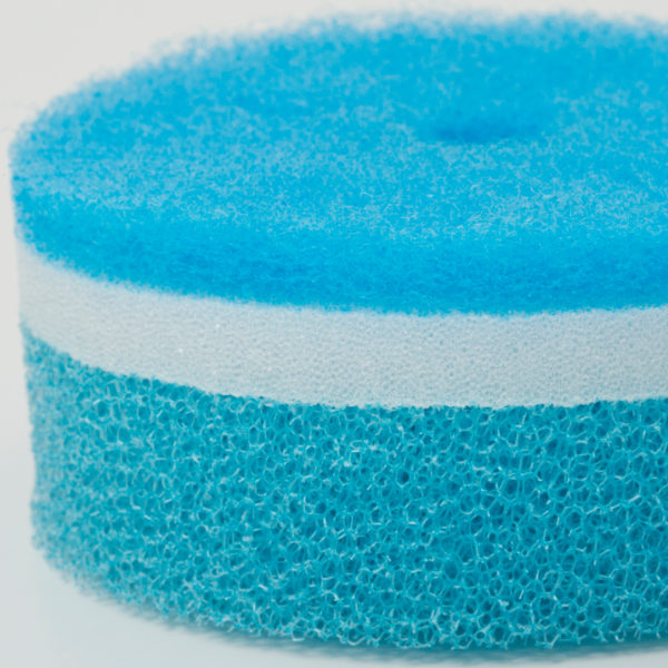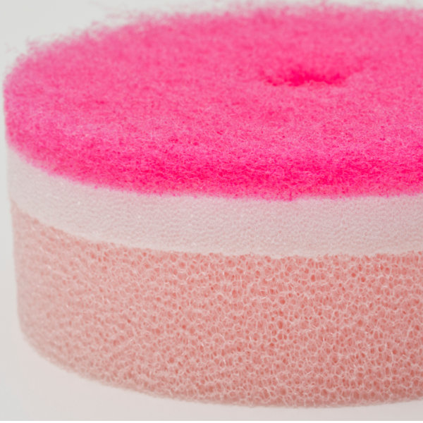 表面のナイロン不織布層はガンコ汚れやフライパン等の磨き上げに。中間のウレタンフォーム層は少量の洗剤でもしっかりキープ。脱膜ウレタン層は水切れ、泡立ちが良く耐久に優れています。