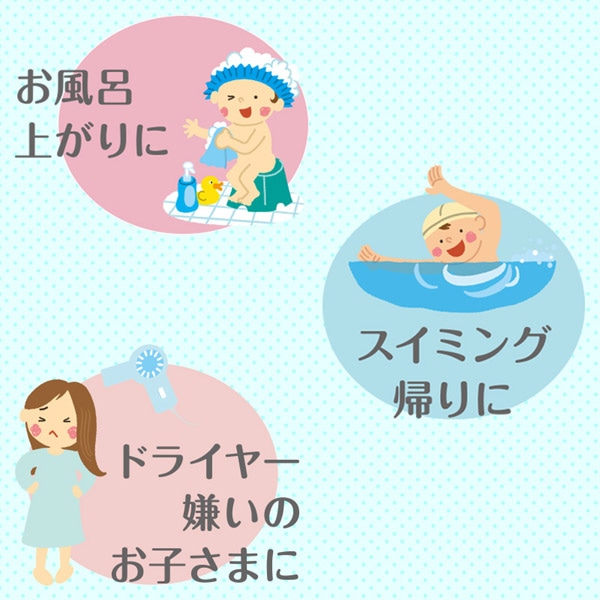 ●お風呂上りに、スイミングの帰りに、ドライヤー嫌いのお子様に、さまざまなシーンでご利用いただけます。