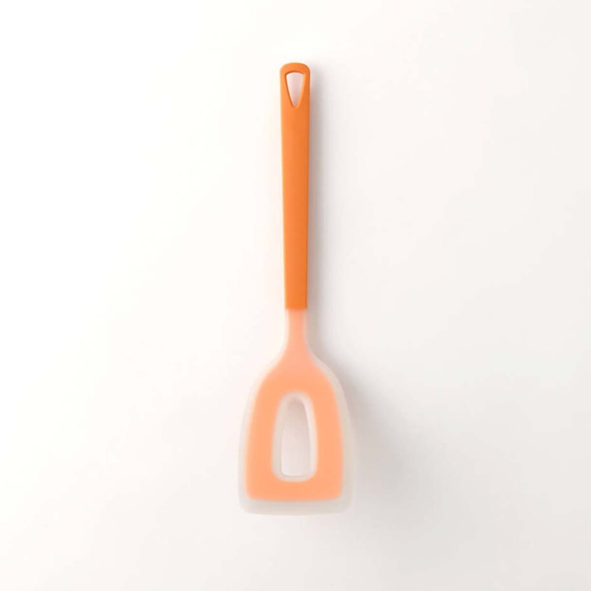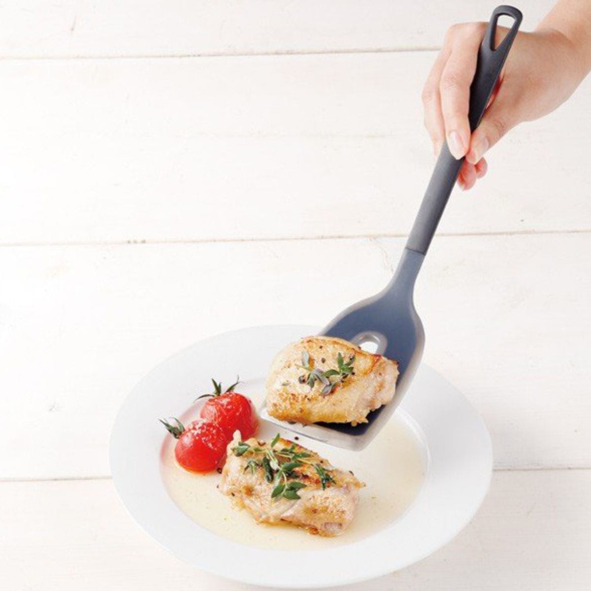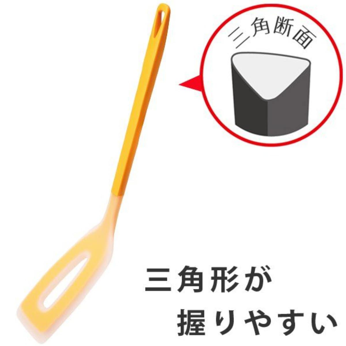 フライパンを傷つけにくい、トライアングリップシリーズのシリコーン製ターナーです。柔らかくしなる薄い先端が食材の下にスッと入り込み、形を崩さずきれいに返せます。