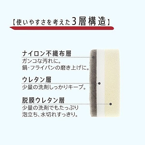 マーナ定番のスポンジと同じ3層構造でお掃除がしやすくなっています。抜群の泡立ちと泡持ちで汚れが落としやすく、水垢もしっかりと絡め取ります。水切れも良いので衛生的にお使いいただけます。
