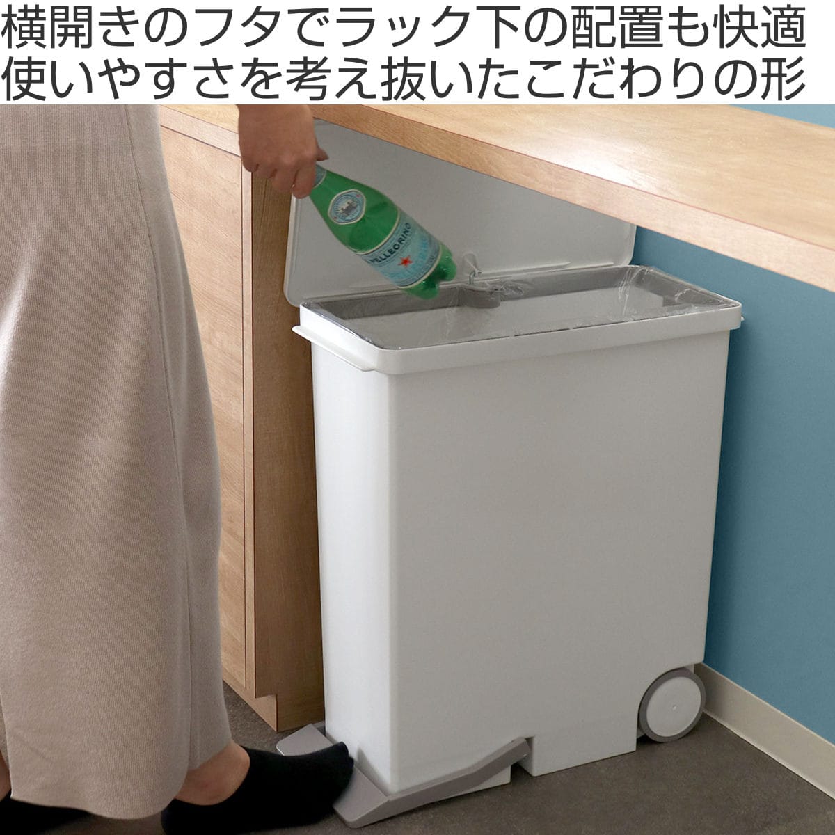 後部にはキャスター、上部の両サイドには取っ手が付いているので、ラック下・カウンター下配置でのゴミ出し作業もスムーズに行えます。
