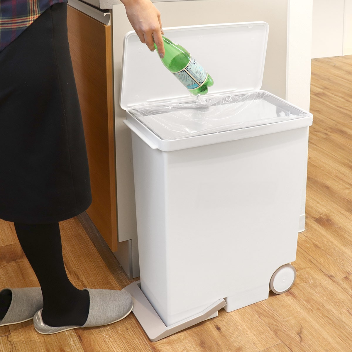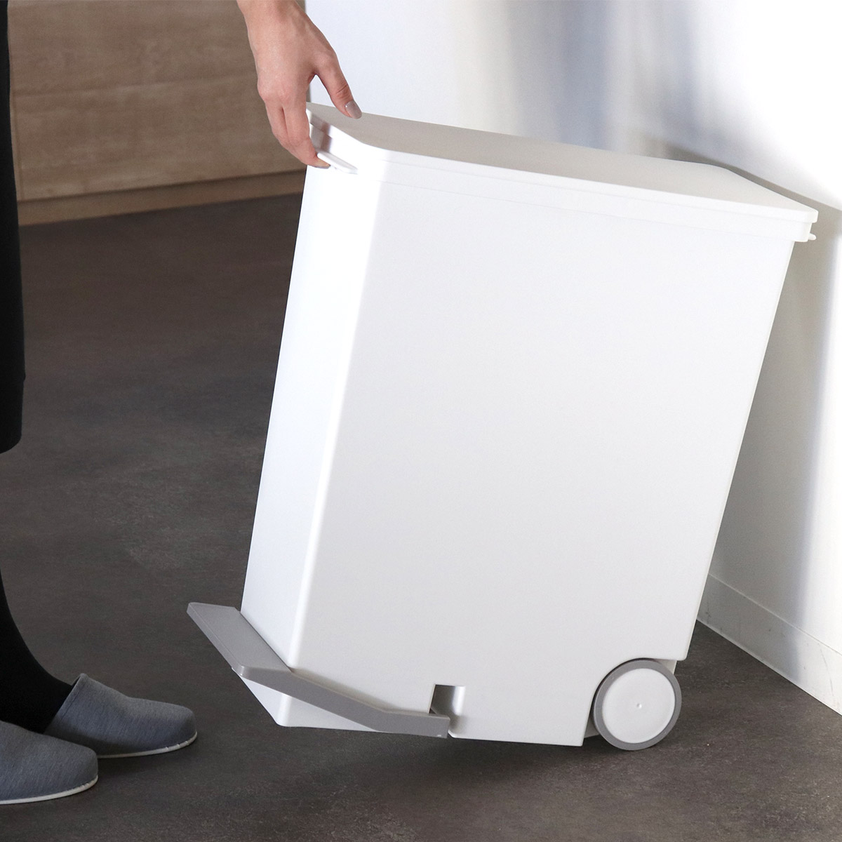 フタの開閉はフットペダル式を採用しました。両手が塞がっていたり、お料理中の汚れた手でも問題ありません。