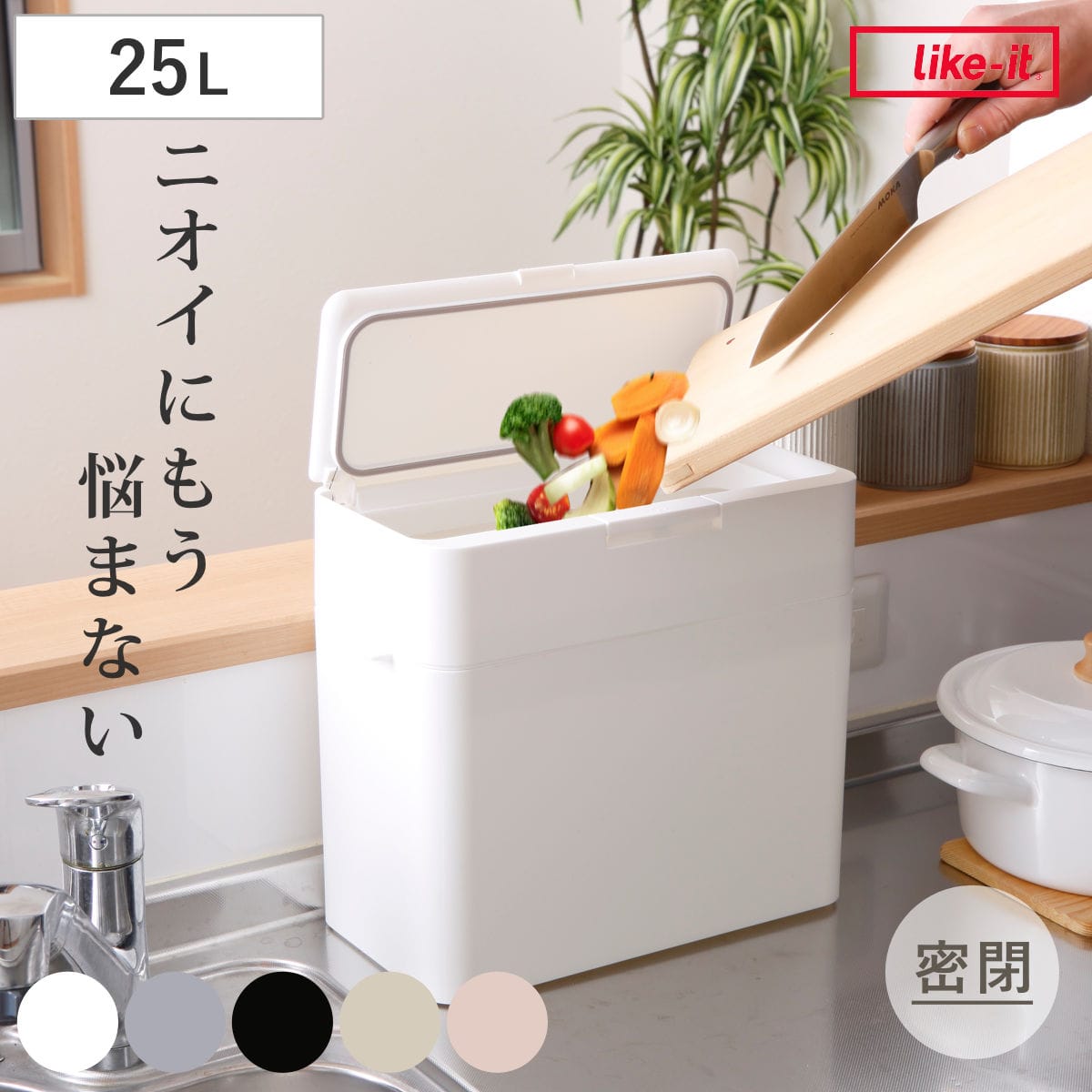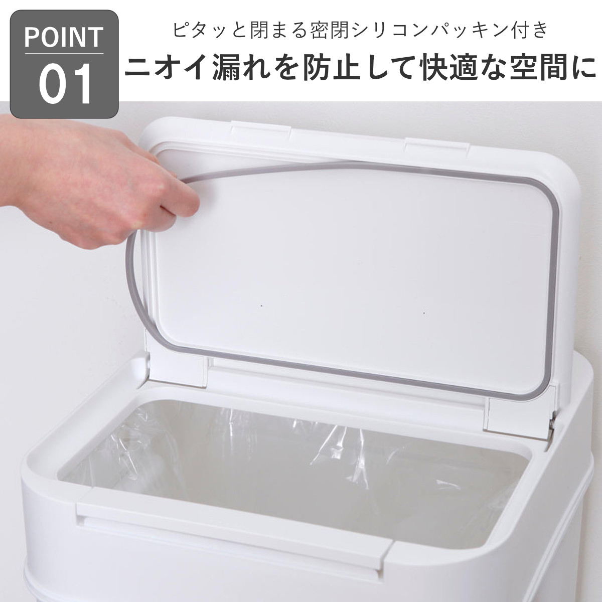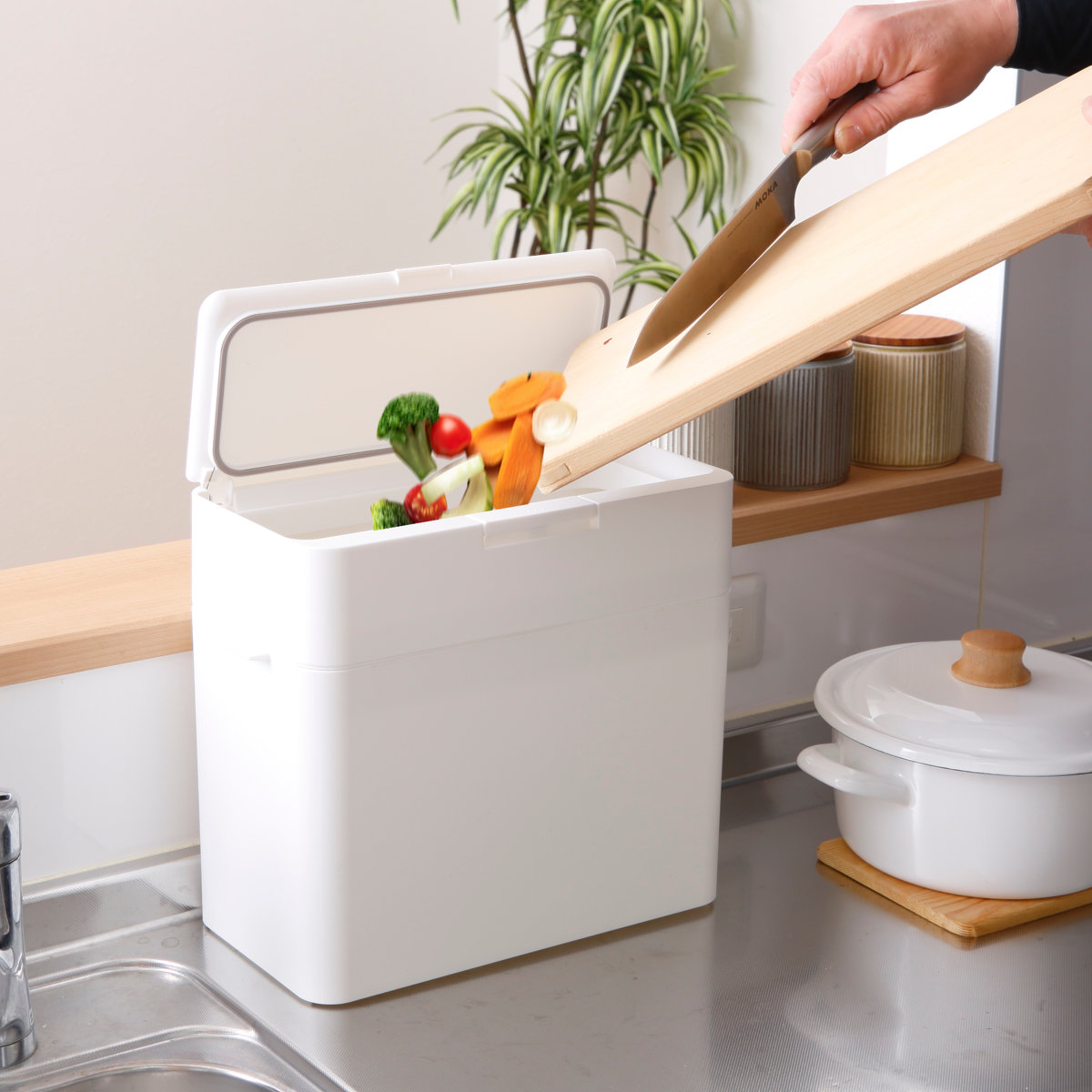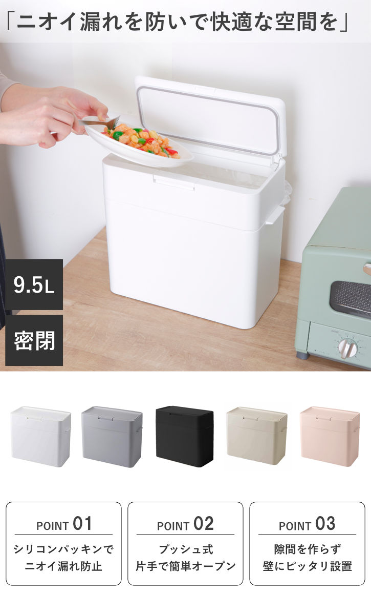 ピタッと閉まるシリコンパッキン付きのふたで、ニオイ漏れをしっかり抑えます。生ごみ用のダストボックスとしてシンク上に置けば、その場でサッと捨てられて便利。ゴミを溜めてから移す手間が省け、家事の効率もアップします。ニオイが気になりにくく、キッチンを快適な空間に保てます。