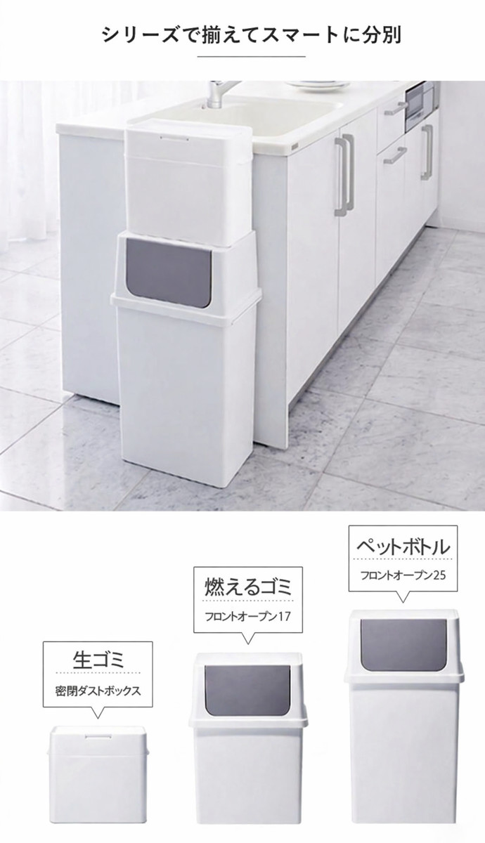 シールズフロントオープンタイプ(別売り)とスタッキングが可能。シリーズで揃えて使うことで、すっきりとした見た目でスマートに分別できます。