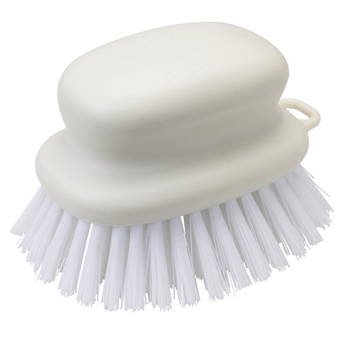 握りやすく、力の入れやすい形のお掃除ブラシです。凸凹した広い床面をゴシゴシと洗えます。先端が広がったブラシなので、壁ぎわやスミにもしっかり届きます。